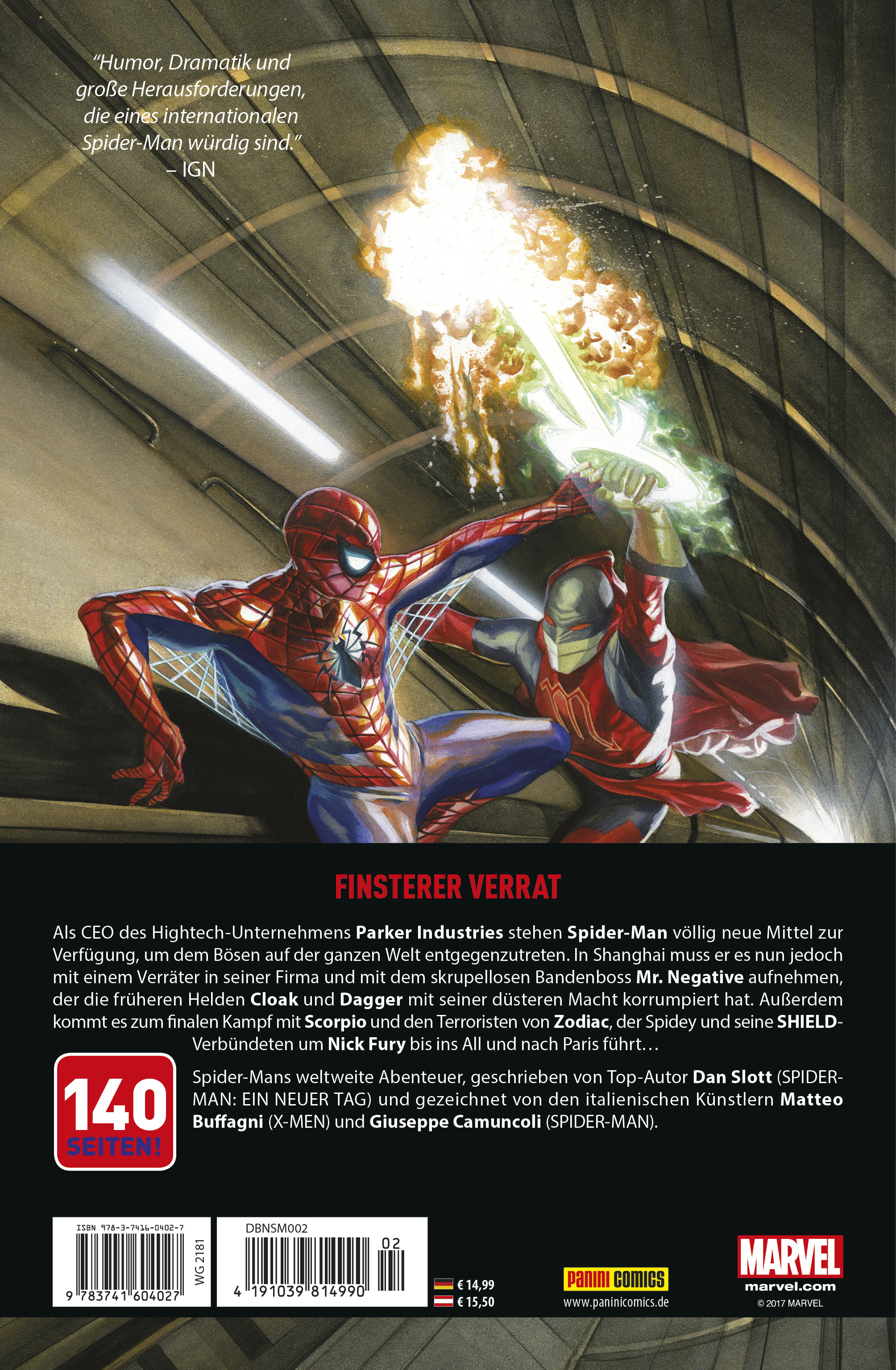 FINSTERER VERRATAls CEO des Hightech-Unternehmens Parker Industries stehen Spider-Man völlig neue Mittel zur Verfügung, um dem Bösen auf der ganzen Welt entgegenzutreten. In Shanghai muss er es nun jedoch mit einem Verräter in seiner Firma und mit dem skrupellosen Bandenboss Mr. Negative aufnehmen, der die früheren Helden Cloak und Dagger mit seiner düsteren Macht korrumpiert hat. Außerdem kommt es zum finalen Kampf mit Scorpio und den Terroristen von Zodiac, der Spidey und seine SHIELD-Verbündeten um Nick Fury bis ins All und nach Paris führt...Spider-Mans weltweite Abenteuer, geschrieben von Top-Autor Dan Slott (SPIDERMAN: EIN NEUER TAG) und gezeichnet von den italienischen Künstlern Matteo Buffagni (X-MEN) und Giuseppe Camuncoli (SPIDER-MAN).