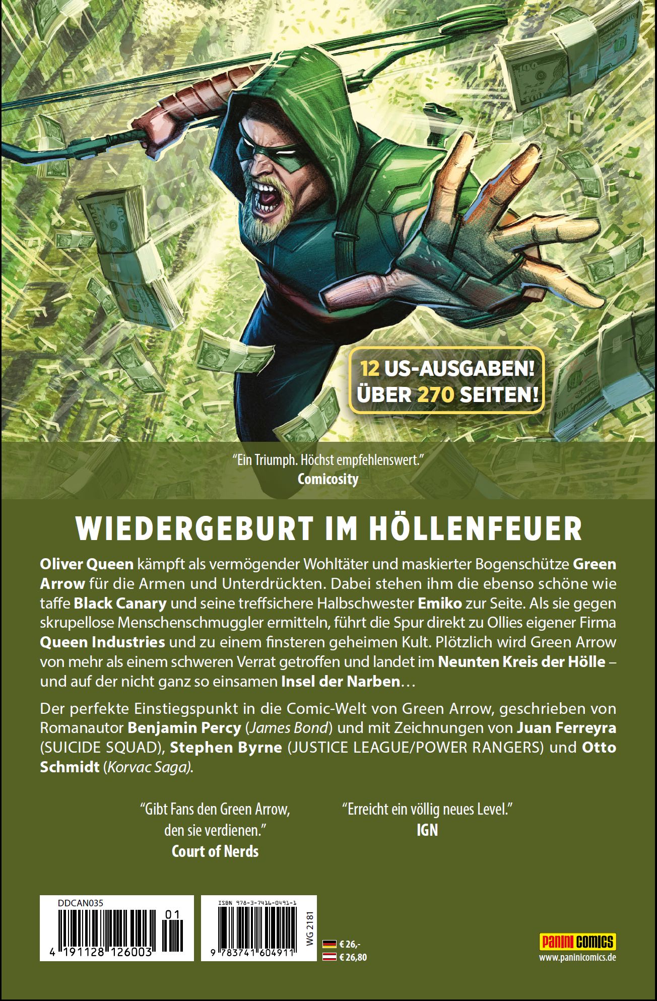 WIEDERGEBURT IM HÖLLENFEUEROliver Queen kämpft als vermögender Wohltäter und maskierter Bogenschütze Green Arrow für die Armen und Unterdrückten. Dabei stehen ihm die ebenso schöne wie taffe Black Canary und seine treffsichere Halbschwester Emiko zur Seite. Als sie gegen skrupellose Menschenschmuggler ermitteln, führt die Spur direkt zu Ollies eigener Firma Queen Industries und zu einem finsteren geheimen Kult. Plötzlich wird Green Arrow von mehr als einem schweren Verrat getroffen und landet im Neunten Kreis der Hölle - und auf der nicht ganz so einsamen Insel der Narben...Der perfekte Einstiegspunkt in die Comic-Welt von Green Arrow, geschrieben von Romanautor Benjamin Percy (James Bond) und mit Zeichnungen von Juan Ferreyra (SUICIDE SQUAD), Stephen Byrne (JUSTICE LEAGUE/POWER RANGERS) und Otto Schmidt (Korvac Saga).