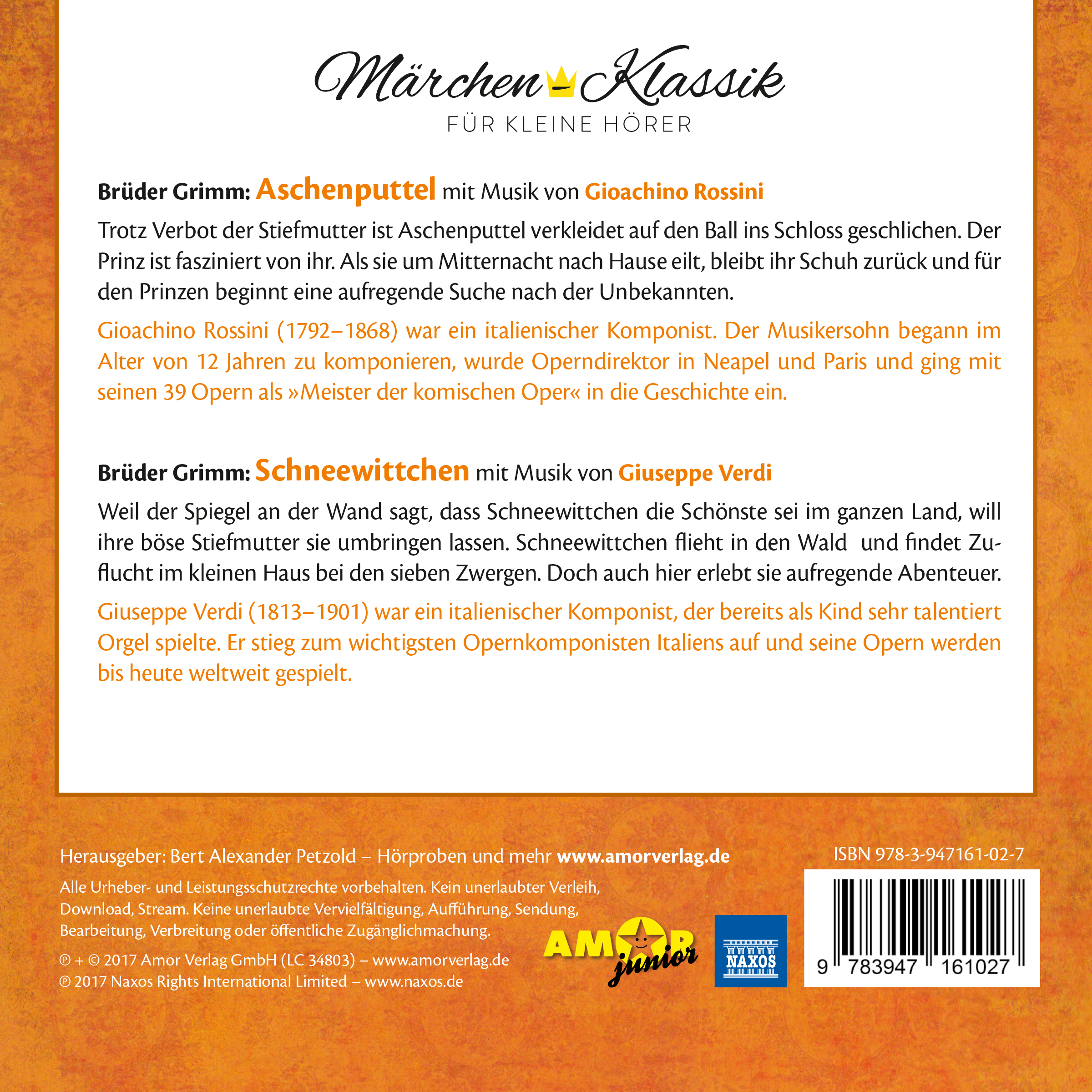 | Schlagworte | Aschenputtel • Belletristik und verwandte Gebiete • Brüder Grimm • Gioachino Rossini • Giuseppe Verdi • Hörbuch; Hörspiel für Kinder/Jugendliche • Hörbuch; Literatur und Musik • Hörbuch; Märchen/Sagen • Hörspiel • Kinder, Jugendliche und Bildung • Klassik • Märchen • Musik • Schneewittchen |