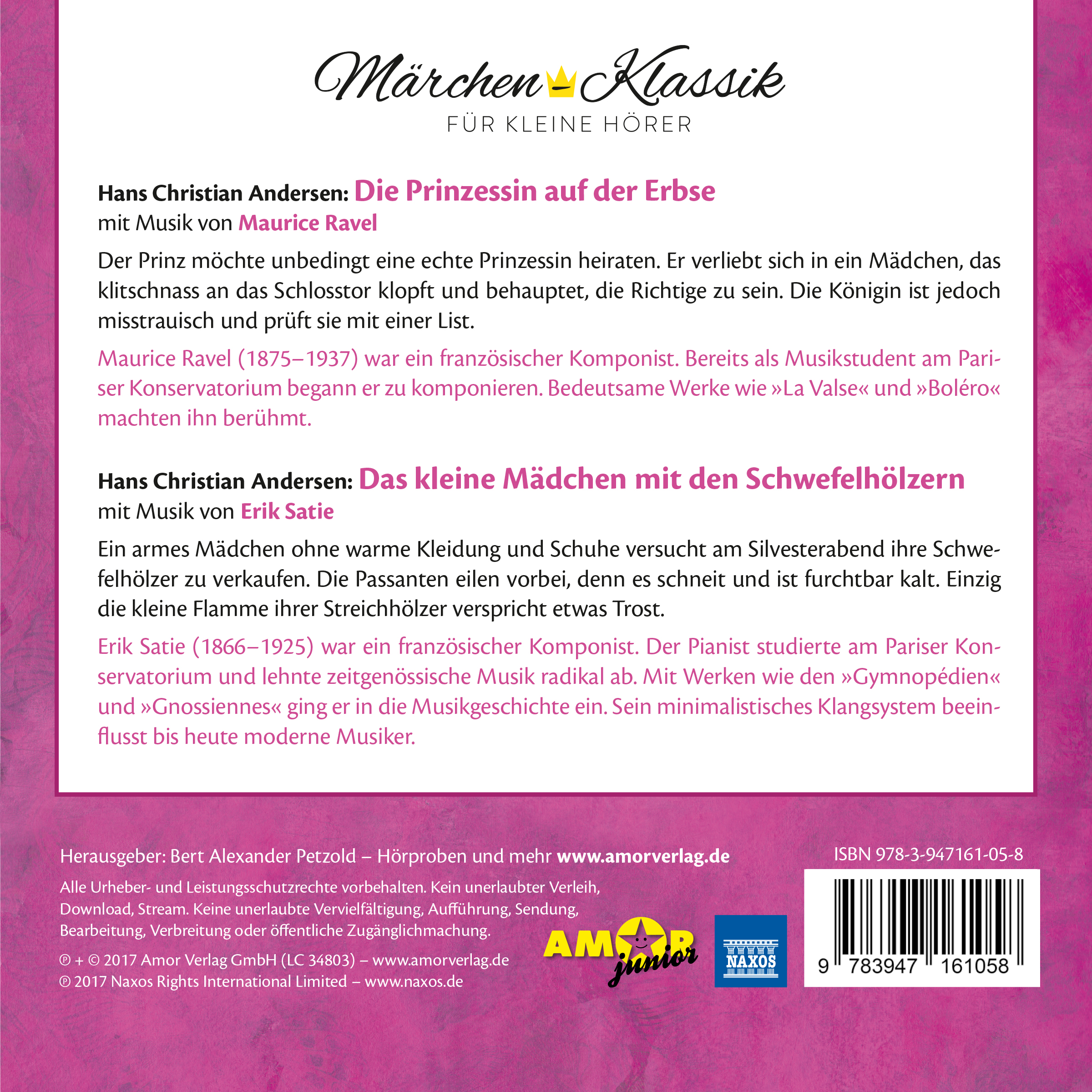 | Schlagworte | Belletristik und verwandte Gebiete • Das kleine Mädchen mit den Schwefelhölzern • Die Prinzessin auf der Erbse • Erik Satie • Hans Christian Andersen • Hörbuch; Hörspiel für Kinder/Jugendliche • Hörbuch; Literatur und Musik • Hörbuch; Märchen/Sagen • Hörspiel • Kinder, Jugendliche und Bildung • Klassik • Märchen • Maurice Ravel • Musik |