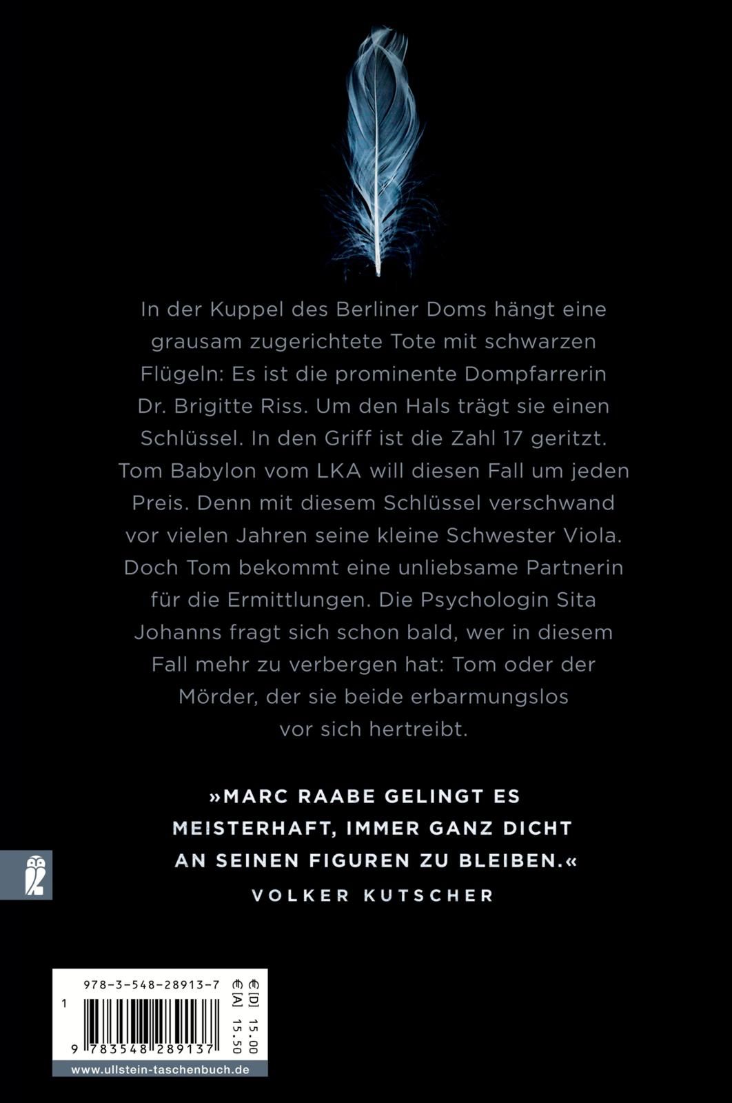 In der Kuppel des Berliner Doms hängt eine grausam zugerichtete Tote mit schwarzen Flügeln: Es ist die prominente Dompfarrerin Dr. Brigitte Riss. Um den Hals trägt sie einen Schlüssel. In den Griff ist die Zahl 17 geritzt. Tom Babylon vom LKA will diesen Fall um jeden Preis. Denn mit diesem Schlüssel verschwand vor vielen Jahren seine kleine Schwester Viola. Doch Tom bekommt eine unliebsame Partnerin für die Ermittlungen. Die Psychologin Sita Johanns fragt sich schon bald, wer in diesem Fall mehr zu verbergen hat: Tom oder der Mörder, der sie beide erbarmungslos vor sich hertreibt.