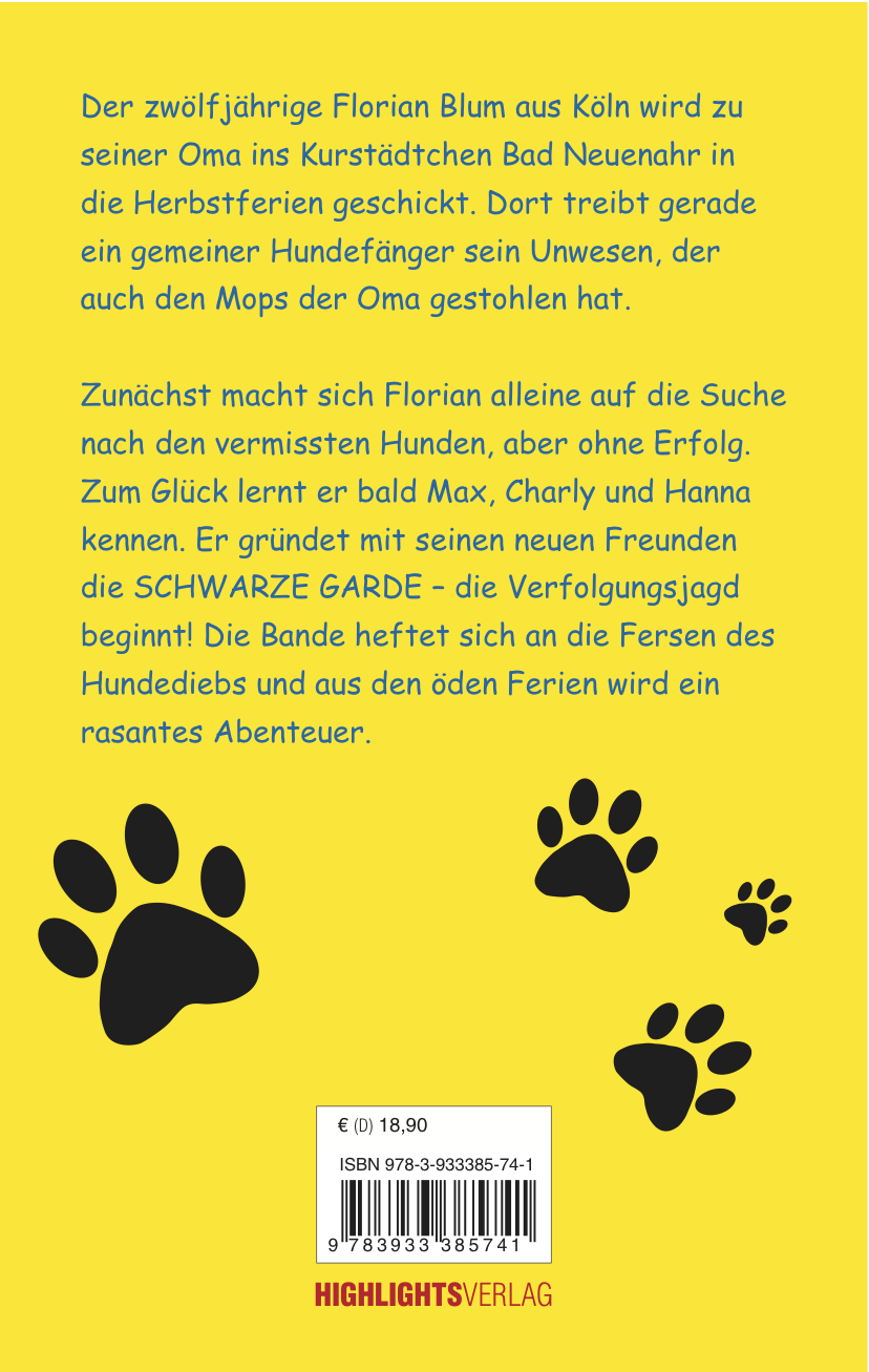 Der zwölfjährige Florian Blum aus Köln wird zu seiner Oma ins Kurstädtchen Bad Neuenahr in die Herbstferien geschickt. Dort treibt gerade ein gemeiner Hundefänger sein Unwesen, der auch den Mops der Oma gestohlen hat. Zunächst macht sich Florian alleine auf die Suche nach den vermissten Hunden, aber ohne Erfolg. Zum Glück lernt er bald Max, Charly und Hanna kennen. Er gründet mit seinen neuen Freunden die SCHWARZE GARDE. Die Verfolgungsjagd beginnt! Die Bande heftet sich an die Fersen des Hundediebs und aus den öden Ferien wird ein rasantes Abenteuer.