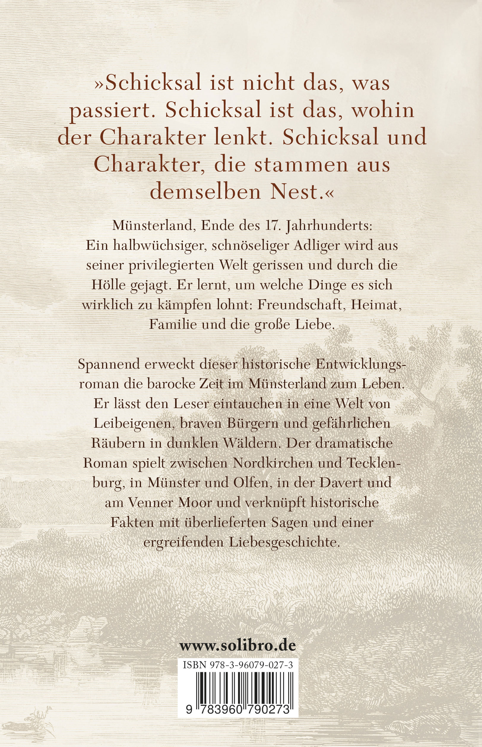 Münsterland, Ende des 17. Jahrhunderts: Ein halbwüchsiger, schnöseliger Adliger wird aus seiner privilegierten Welt gerissen und durch die Hölle gejagt. Er lernt, um welche Dinge es sich wirklich zu kämpfen lohnt: Freundschaft, Heimat, Familie und die große Liebe.