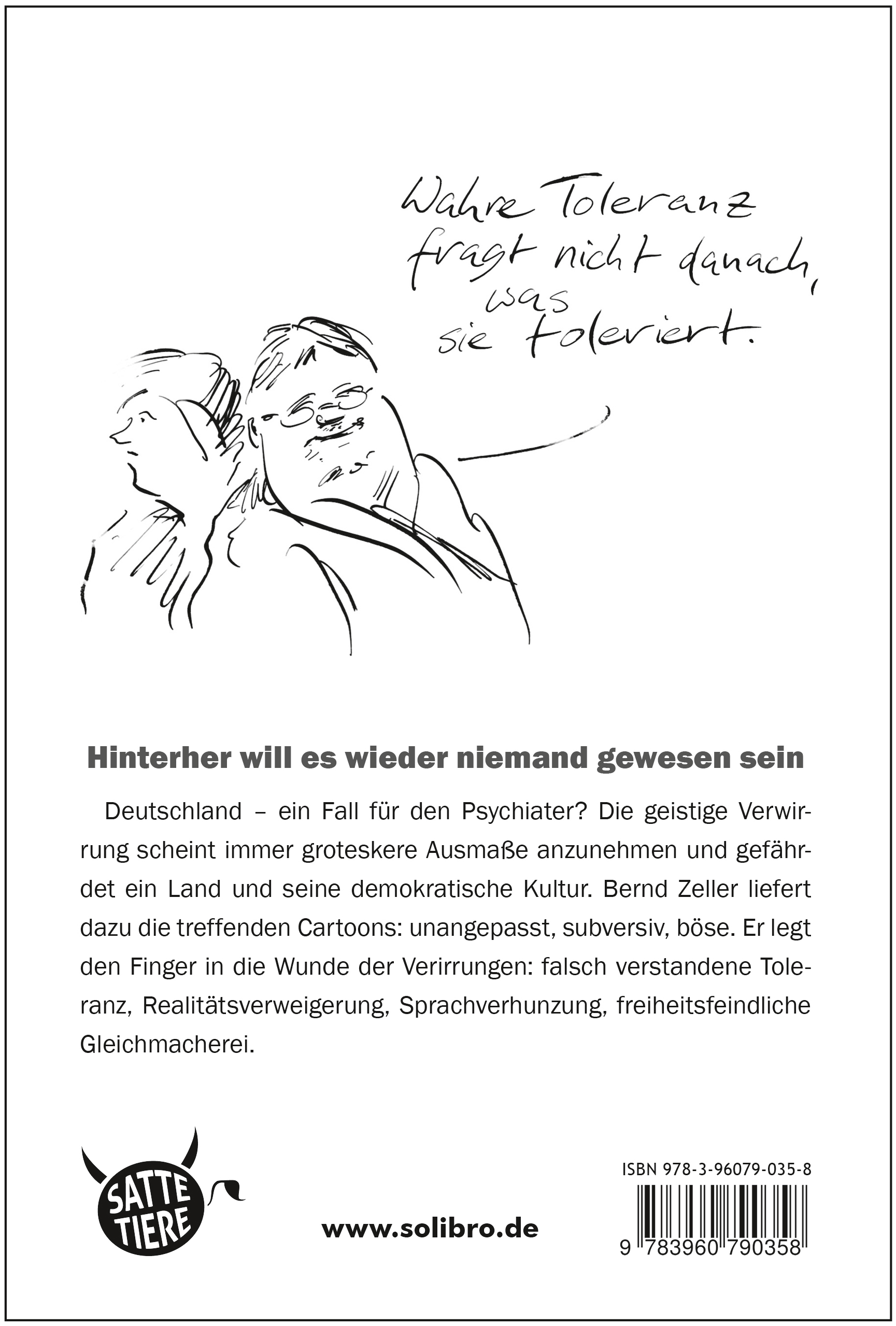 Deutschland - ein Fall für den Psychiater? Die geistige Verwirrung scheint immer groteskere Ausmaße anzunehmen und gefährdet ein Land und seine demokratische Kultur. Bernd Zeller liefert dazu die treffenden Cartoons: unangepasst, subversiv, böse. Er legt den Finger in die Wunde der Verirrungen: falsch verstandene Toleranz, Realitätsverweigerung, Sprachverhunzung, freiheitsfeindliche Gleichmacherei. Er nimmt die Ideologen, Rabulisten und gutmenschlichen Agitatoren beim Wort und entlarvt sie mit ihrer eigenen (Un-)Logik. Auch die Gängelung durch selbsternannte Sprach- und Sittenwächter, das fragwürdige Rechtsverständnis mancher Politiker und die Verunglimpfung des Souveräns werden thematisiert. Die vermeintliche Utopie einer gerechteren Republik wird als das entlarvt, was sie ist: eine Dystopie machtbesessener Gesinnungseliten und ihrer willfährigen Mitläufer.