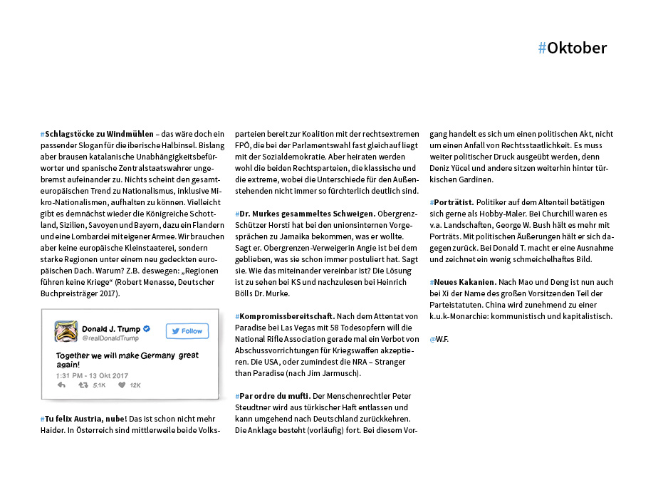 | Schlagworte | 2017 • #Alles Fake • Cartoons • CDU • Deutschland • Donald • Fake News • Graphic Novels und Comics: Formate • Jahrbuch • Jahresband • Jahresrückblick • Karikaturen • Merkel • Politik • Populismus • Putin • Schulz • Stuttmann • Tagesspiegel • Trump • Twitter • USA |