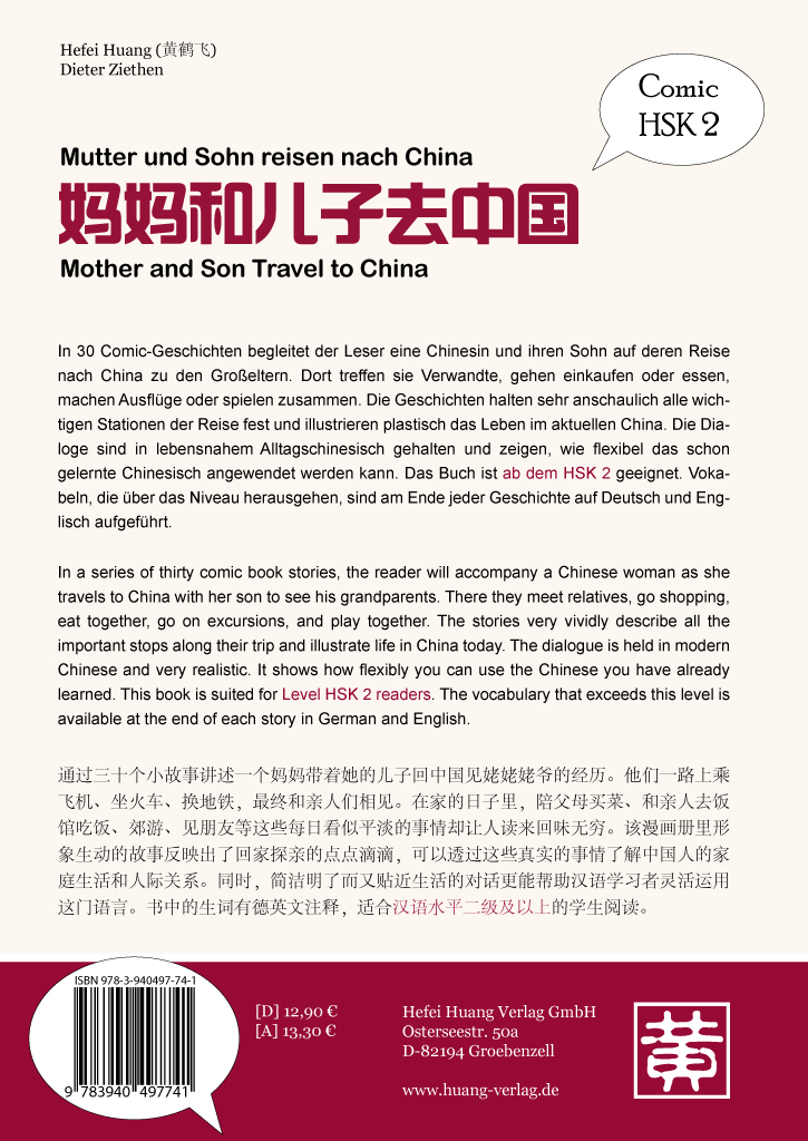 妈妈和儿子去中国:通过三十个小故事讲述一个妈妈带着儿子回中国见姥姥姥爷的经历。他们一路上乘飞机、坐火车、换地铁,最终和亲人们相见。在家的日子里,陪父母买菜、和亲人去饭馆吃饭、郊游、见朋友等这些每日看似平淡的事情却让人读来回味无穷。该漫画册里形象生动的故事反映出了回家探亲的点点滴滴,可以透过这些真实的事情了解中国人的家庭生活和人际关系。同时,简洁明了而又贴近生活的对话更能帮助汉语学习者灵活运用这门语言。书中的生词有德英文注释,适合汉语水平二级及以上的学生阅读。 Mother and Son Travel to China: In a series of thirty comic book stories, the reader will accompany a Chinese woman as she travels to China with her son to see his grandparents. There they meet relatives, go shopping, eat together, go on excursions, and play together. The stories very vividly describe all the important stops along their trip and illustrate life in China today. The dialogue is held in modern Chinese and very realistic. It shows how flexibly you can use the Chinese you have already learned. This book is suited for Level HSK2 readers. The vocabulary that exceeds this level is available at the end of each story in German and English. In 30 Comic-Geschichten begleitet der Leser eine Chinesin und ihren Sohn auf deren Reise nach China zu den Großeltern. Dort treffen sie Verwandte, gehen einkaufen oder essen, machen Ausflüge oder spielen zusammen. Die Geschichten halten sehr anschaulich alle wichtigen Stationen der Reise fest und illustrieren plastisch das Leben im aktuellen China. Die Dialoge sind in lebensnahem Alltagschinesisch gehalten. Das Buch ist ab dem HSK 2 geeignet. Vokabeln, die über das Niveau herausgehen, sind am Ende jeder Geschichte auf Deutsch und Englisch aufgeführt.