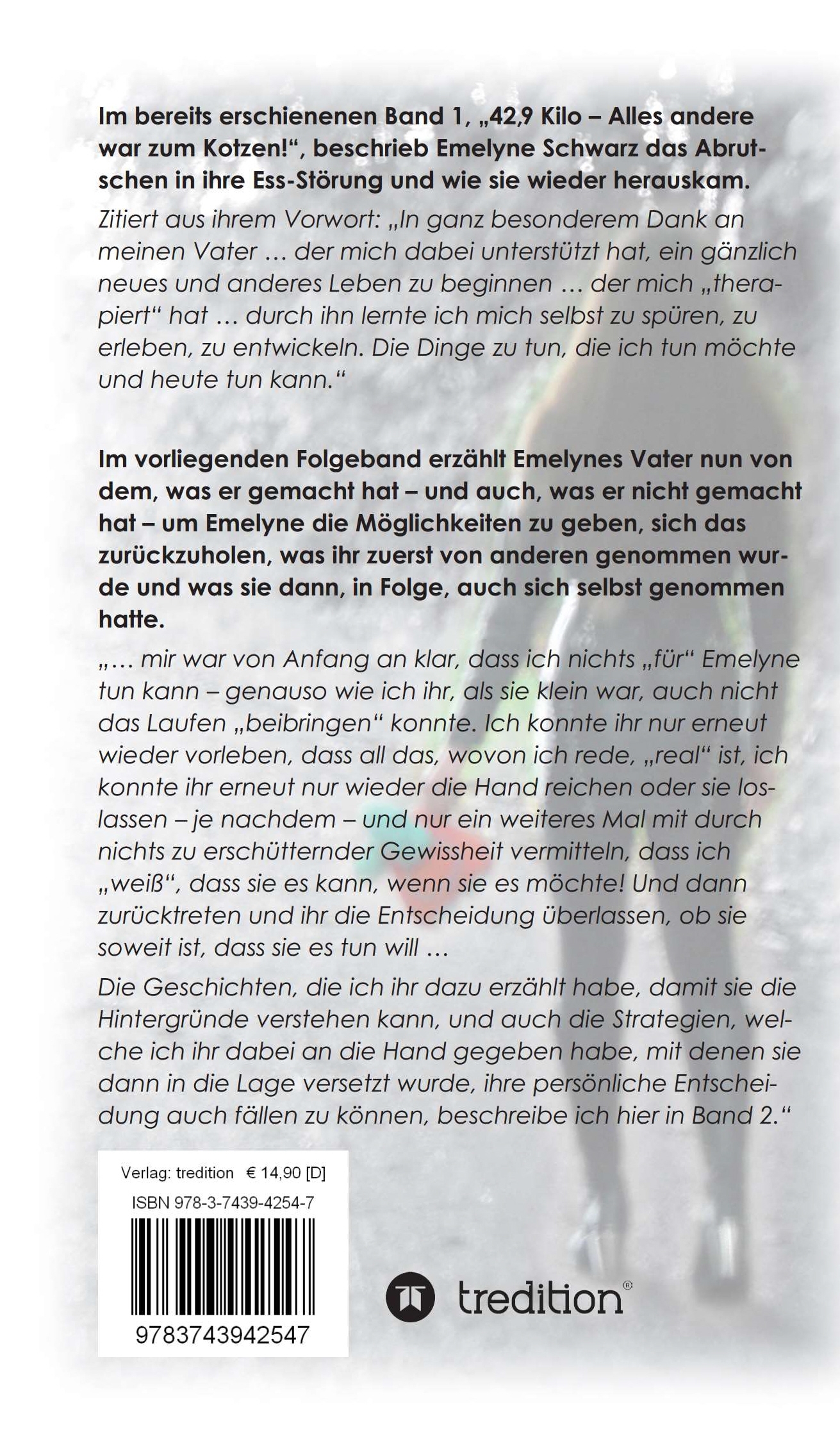 Im bereits erschienenen Buch "42,9 Kilo - Band 1: Alles andere war zum Kotzen!", beschrieb Emelyne Schwarz das Abrutschen in ihre Ess-Störung und wie sie, mit Unterstützung ihres Vaters, alleine wieder herauskam. Im vorliegenden Folgeband erzählt Emelynes Vater nun von dem, was er gemacht hat - und auch, was er nicht gemacht hat - um Emelyne die Möglichkeiten zu geben, sich das zurückzuholen, was ihr zuerst von anderen genommen wurde und was sie dann, in Folge, auch sich selbst genommen hatte. (Beide Bücher sind zusammen auch als günstigerer Sammelband verfügbar!)