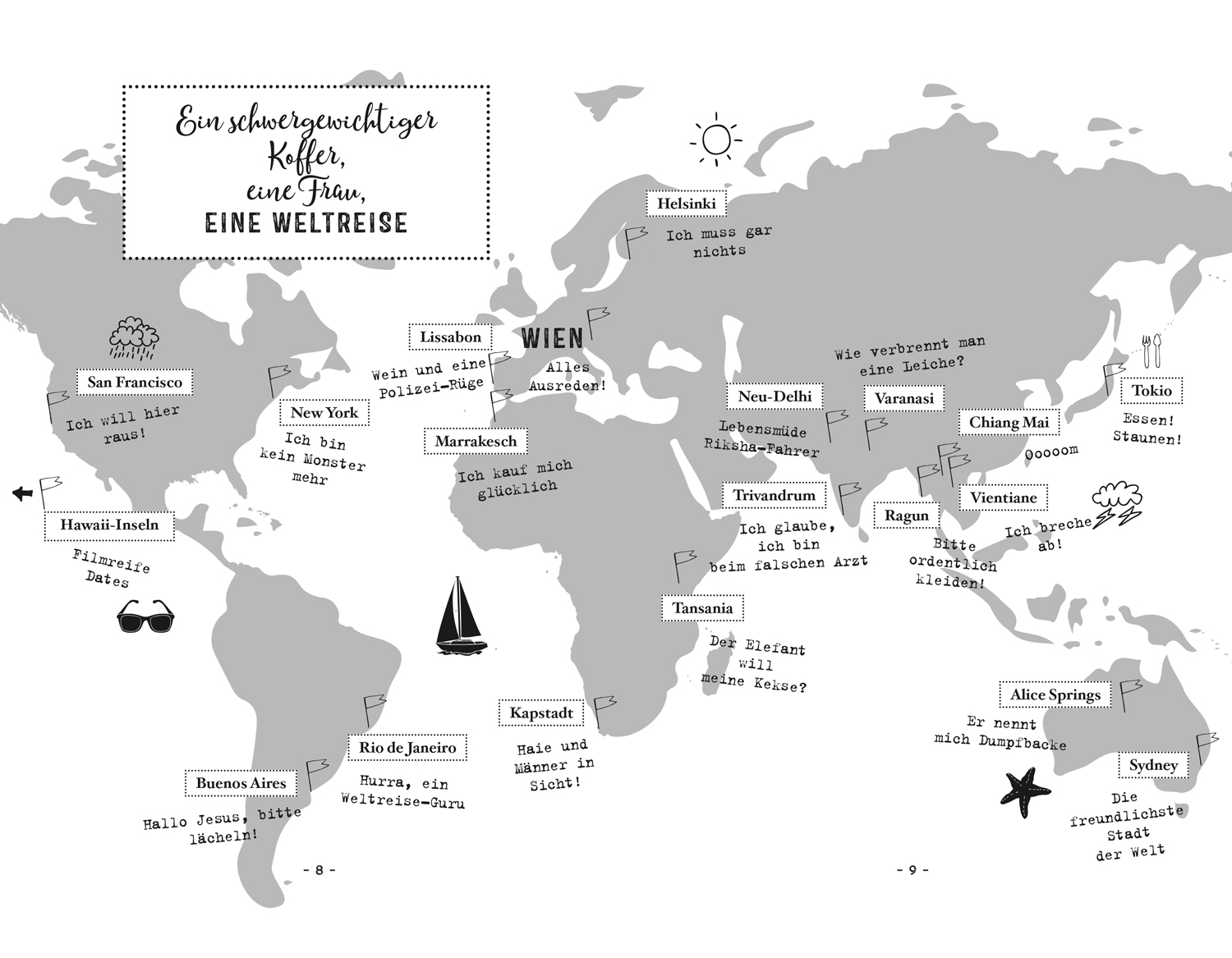 lt;p>Was passiert, wenn eine Frau mit Ende 30 ihr altes Leben hinschmeißt, alle Ersparnisse zusammenkratzt und elf Monate alleine auf Weltreise geht - mit einem übergewichtigem Rollkoffer und jeder Menge Zweifel im Gepäck? Antwort: Der innere Kontrollfreak flippt erstmal aus und beruhigt sich dann damit, dass man auch mit drei fetten Spinnen im Zimmer und ohne die Lieblings-Bodylotion überleben kann.