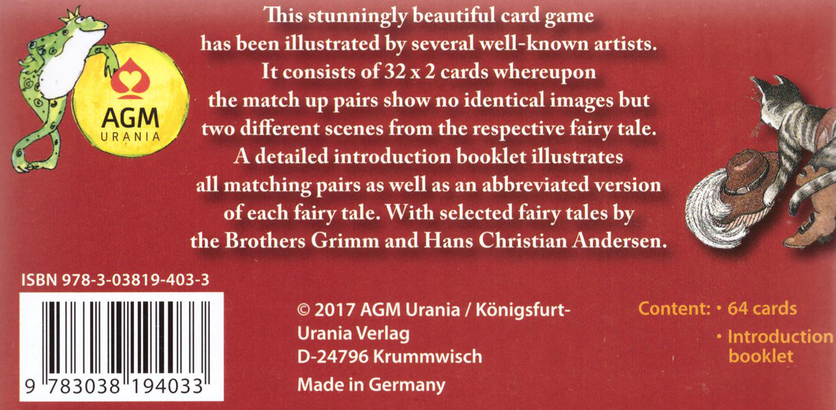 This stunningly beautiful card game has been illustrated by several well-known artists. It consists of 32 x 2 cards whereupon the match up pairs show no identical images but two different scenes from the respective fairy tale. A detailed introduction booklet illustrates all matching pairs as well as an abbreviated version of each fairy tale. With selected fairy tales by the Brothers Grimm and Hans Christian Andersen.