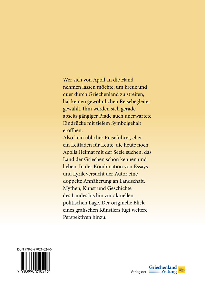 Also kein üblicher Reiseführer, eher ein Leitfaden für Leute, die heute noch Apolls Heimat mit der Seele suchen. In der Kombination von Essays und Lyrik versucht der Autor eine doppelte Annäherung an Landschaft, Mythen, Kunst und Geschichte des Landes bis hin zur aktuellen politischen Lage. Der originelle Blick eines grafischen Künstlers fügt weitere Perspektiven hinzu.