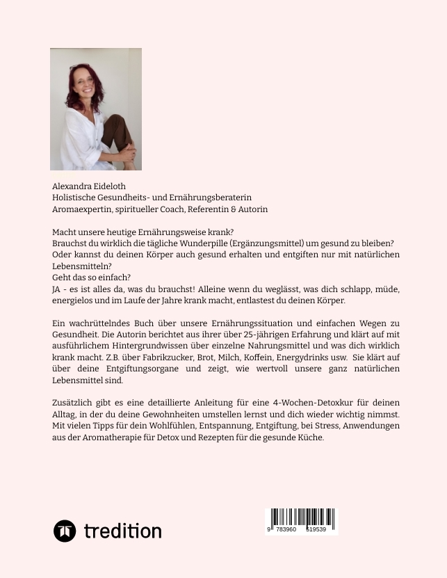 Alexandra Eideloth, geb. 1969, ist seit über 25 Jahren als Ganzheitliche Gesundheits- und Ernährungsberaterin in eigener Praxis tätig. In ihrem Buch schreibt sie aus ihrem reichen Erfahrungsschatz über die Wertigkeit unserer heutigen Industrienahrung, die Auswirkungen auf unsere Gesundheit und wie einfach wir aus diesen Gewohnheiten ausbrechen können in einen gesunden und leichten Essalltag. Nach ihrer Ausbildung 1985 als Arzthelferin, folgten Ausbildungen als Gesundheitsberaterin (bei Dr. Max Otto Bruker), als Aromaexpertin, als Fachberaterin für Holistische Gesundheit, zahlreiche Fortbildungen und seit 2018 Ausbildungen in Energeiarbeit und spirituellem Coaching. Seit 1996 ist sie als freiberufliche Gesundheitsberaterin selbständig tätig und zeigt ihren KundInnen Wege auf, dass es einfach ist gesund zu leben und wie sie wieder eine Wertschätzung und Liebe ihrem eigenen Körper gegenüber bekommen. Zum Buch "Der Nahrungs-WAHN-SINN" gibt es auch einen begleitenden Onlinekurs "Detox for YOU" Infos siehe hier: https://kursraum-alexandra-eideloth.coachy.net/lp/detox-for-you Website: www.alexandra-eideloth.de Instagram: alexandra_eideloth_holistisch Podcast "Deine Gesundheit ist Deine Entscheidung"