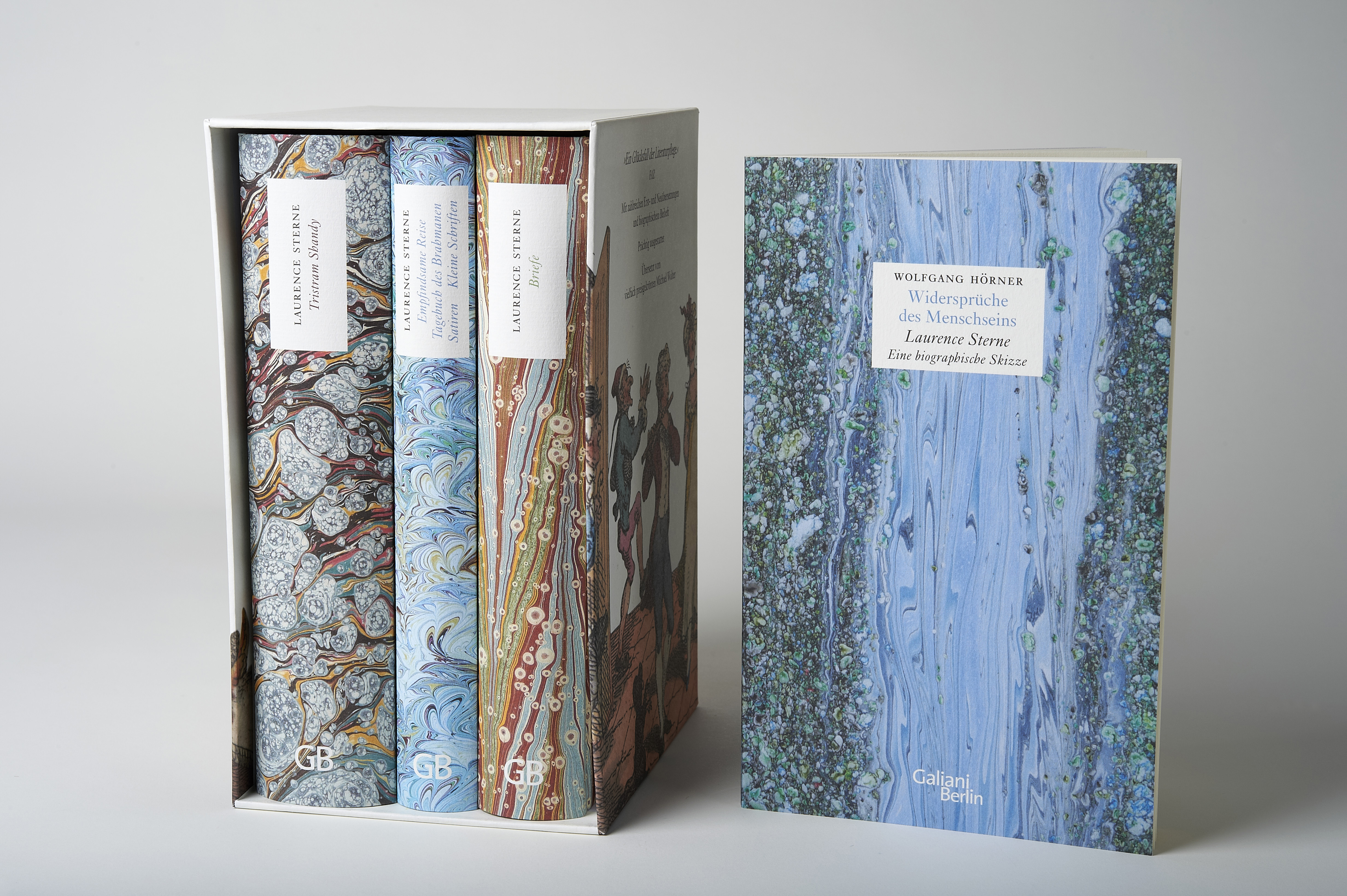 Mit wie viel Sorgfalt diese Werkausgabe komponiert wurde, zeigt sich nicht zuletzt in der Gestaltung: Die marmorierten Einbände sind ein Echo auf Sternes berühmte handgedruckte ‘marbled page’, die jedes Exemplar der Erstausgabe zu einem Unikat machte. Herausgeber Wolfgang Hörner schreibt in seiner ‘Biographischen Skizze’: ‘So, wie das Wesen jedes Menschen anders ist, ist damit auch jedes einzelne Buch individuell.’ Genau wie die Abschweifungen, in denen sich die Leser*innen verlieren.