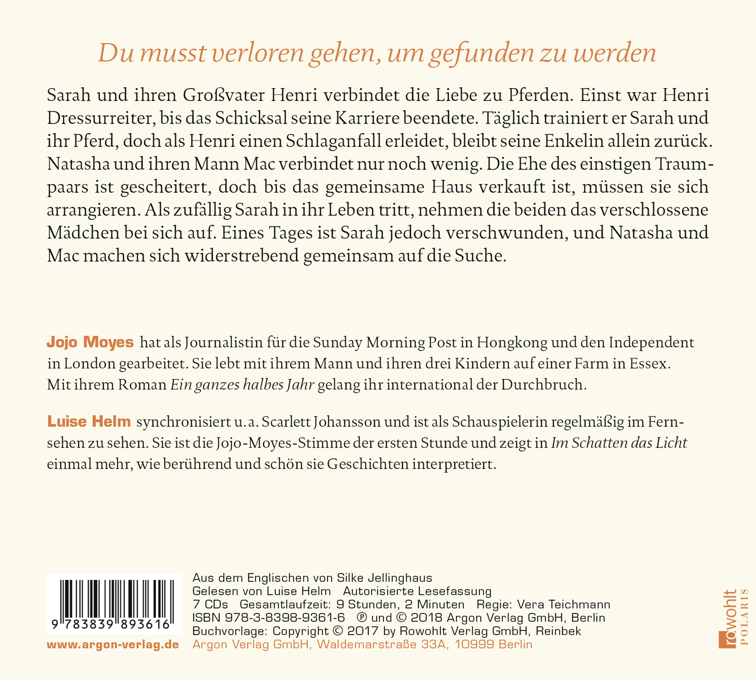 Luise Helm spielte u.a. in Polizeiruf und Tatort mit und ist bekannt als die deutsche Stimme von Scarlett Johansson. Ihre einfühlsamen Lesungen der Romane von Jojo Moyes sind allesamt Hörbuch-Bestseller.