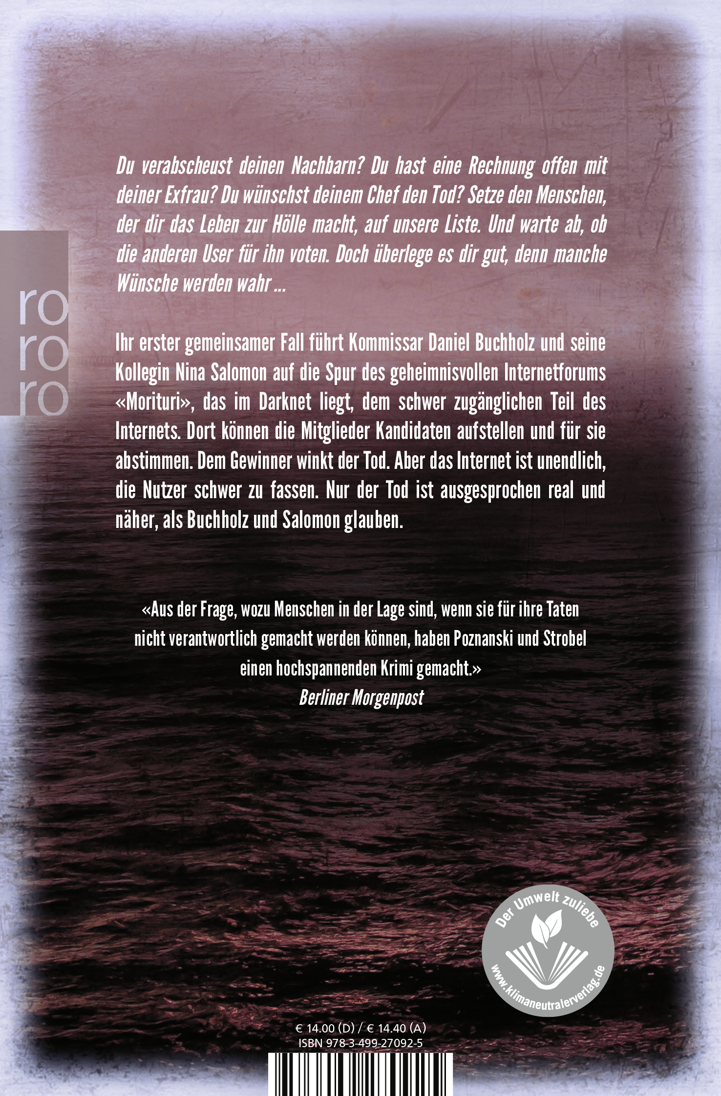Es ist der erste gemeinsame Fall von Kommissar Daniel Buchholz und seiner Kollegin Nina Salomon, und er führt sie auf die Spur des geheimnisvollen Internetforums «Morituri». Dort können die Mitglieder Kandidaten aufstellen und dann für sie abstimmen. Dem Gewinner winkt der Tod. Aber das Internet ist unendlich, die Nutzer schwer zu fassen. Nur der Tod ist ausgesprochen real, und er ist näher, als Buchholz und Salomon glauben ...