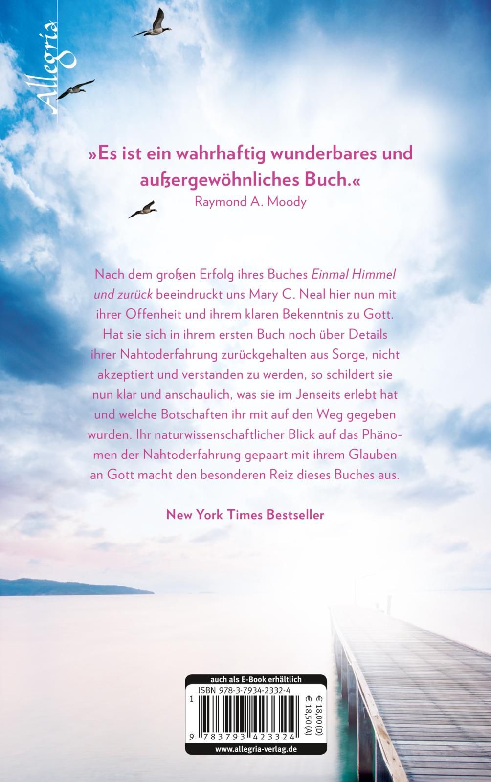 In ihrem neuen Buch erzählt Mary C. Neal, wie sehr der Einblick in Himmelswelten ihr Leben verändert und welche Bedeutung jeder einzelne Lebenstag heute für sie hat. Seit der Nahtoderfahrung lebt sie bewusster, glücklicher und intensiver in ihrer Verbindung zu Gott. Immer wieder jedoch will die Naturwissenschaftlerin in ihr das Erlebte rational verstehen. Aber alle Erklärungen stoßen an Grenzen. Nicht nur der Tod ihres Sohnes, der ihr während ihres Nahtoderlebnisses vorausgesagt wurde, hat sie zu Gott geführt, sondern vor allem die Liebe, die sie im Himmel erfahren hat. Insgesamt sieben Erkenntnisse hat sie von dort mitgebracht: 'Der Tod bedeutet nicht das Ende' ist eine davon. Mit ihrer Erfahrung zeigt sie, wie wir alle Gott im Alltag begegnen und wie wir ein Leben ohne Bedauern, Angst und Sorge gestalten können.