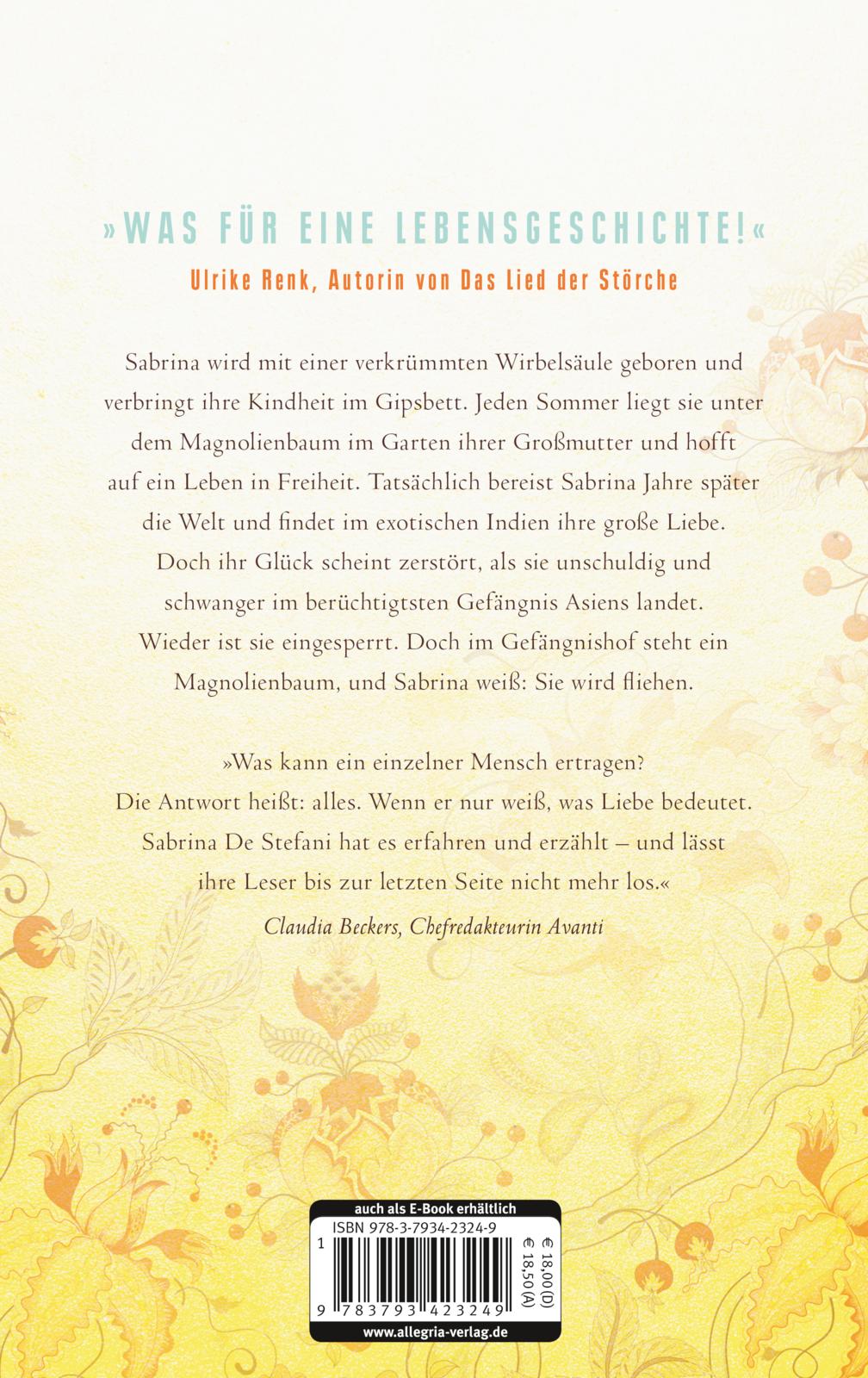 Schon als kleines Kind wird Sabrina auf eine harte Probe gestellt. Jahrelang ans Gipsbett gefesselt, findet sie unter dem blühenden Magnolienbaum im Garten ihrer Großmutter Hoffnung und Trost. Die erwachsene Sabrina schließlich sucht auf abenteuerlichen Reisen ihren Weg zu innerer Freiheit. Vor allem die Exotik Indiens und die Einkehr in Ashrams faszinieren sie. In Gestalt des geheimnisvollen Shankar begegnet ihr die große Liebe. Doch ihr Glück ist nur von kurzer Dauer. Unschuldig landet Sabrina in einem der berüchtigtsten Gefängnisse Asiens. Wieder stößt sie an Grenzen, wieder wird sie in ihrer Freiheit beschnitten. Zudem ist sie schwanger, und ihre Gedanken kreisen einzig darum, wie sie entkommen kann. Doch der Blick auf die blühende Magnolie im Gefängnishof gibt ihr in dieser ausweglosen Situation Zuversicht. Wird ihr die Flucht gelingen?