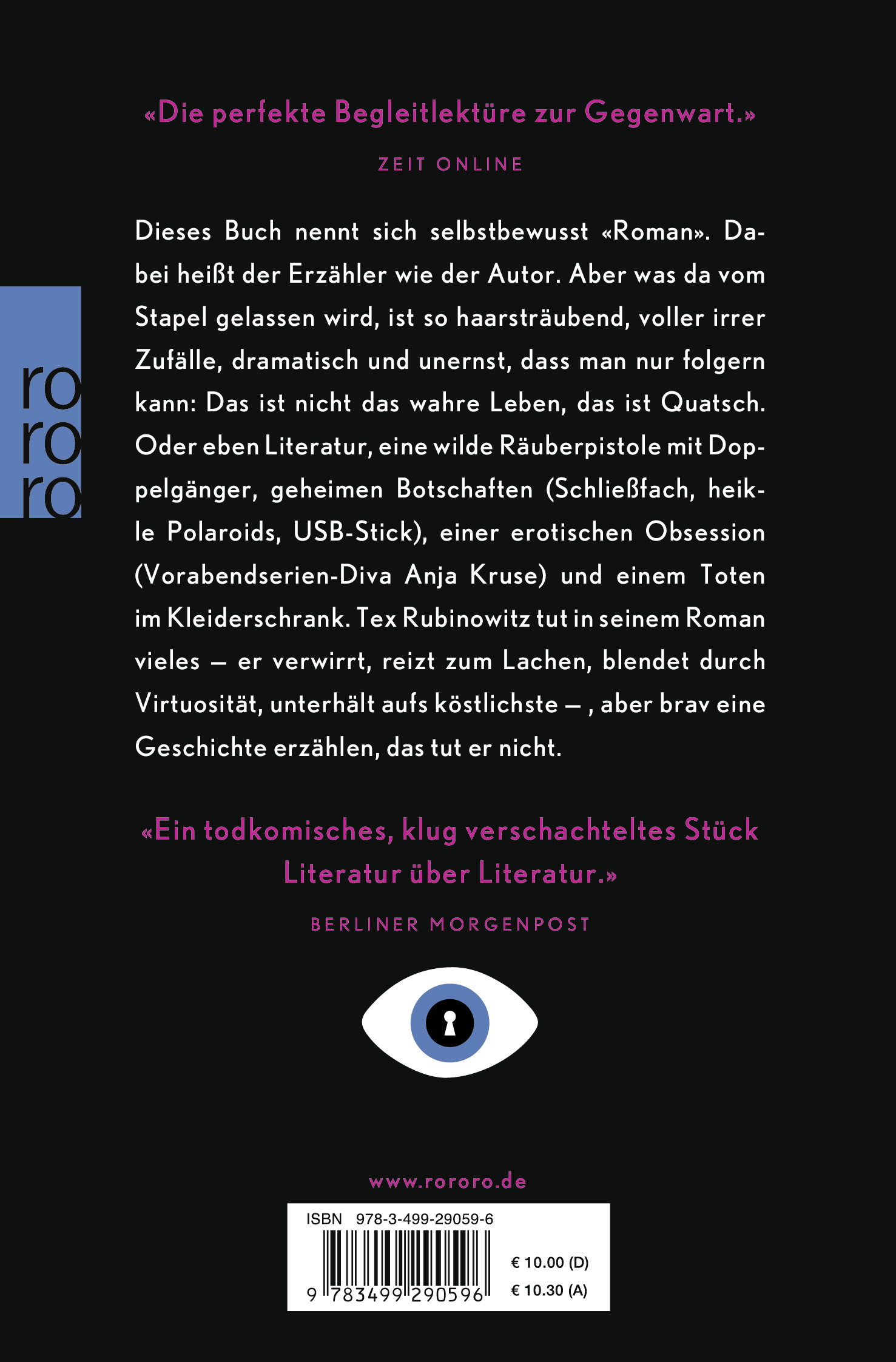 Tex Rubinowitz, geboren 1961 in Hannover, lebt seit 1984 als Witzezeichner, Maler, Musiker und Schriftsteller in Wien. 2014 erhielt er den Bachmann-Preis.