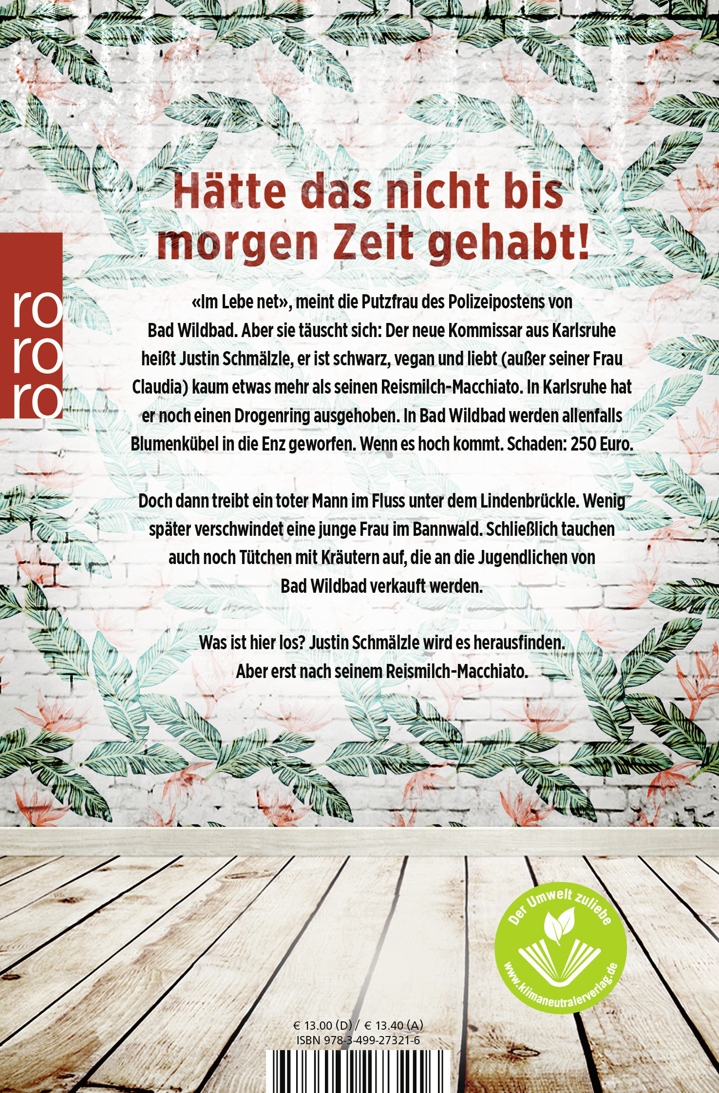 «Im Lebe net», meint die Putzfrau des Polizeipostens von Bad Wildbad. Aber sie täuscht sich: Der neue Kommissar aus Karlsruhe heißt Justin Schmälzle, er ist schwarz, vegan und liebt (außer seiner Frau Claudia) kaum etwas mehr als seinen Reismilch-Macchiato. In Karlsruhe hat er noch einen Drogenring ausgehoben. In Bad Wildbad werden allenfalls Blumenkübel in die Enz geworfen. Wenn es hochkommt. Schaden: 250 Euro.