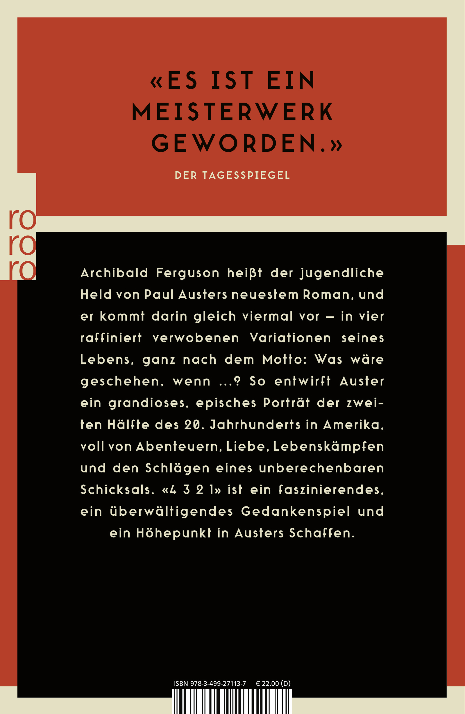 So entwirft Auster ein grandioses, episches Porträt der zweiten Hälfte des 20. Jahrhunderts in Amerika, voller Abenteuer, Liebe, Lebenskämpfe und den Schlägen eines unberechenbaren Schicksals. «4 3 2 1» ist ein faszinierendes, ein überwältigendes Gedankenspiel und ein Höhepunkt in Austers Schaffen.