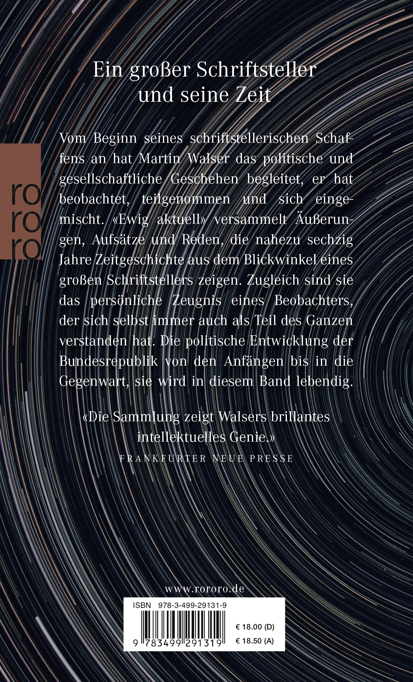 Vom Beginn seines schriftstellerischen Schaffens an hat Martin Walser das politische und gesellschaftliche Geschehen begleitet, er hat beobachtet, teilgenommen und sich eingemischt. «Ewig aktuell» versammelt Äußerungen, Aufsätze und Reden, die nahezu sechzig Jahre Zeitgeschichte aus dem Blickwinkel eines großen Schriftstellers zeigen. Zugleich sind sie das persönliche Zeugnis eines Beobachters, der sich selbst immer auch als Teil des Ganzen verstanden hat. Die politische Entwicklung der Bundesrepublik von den Anfängen bis in die Gegenwart, sie wird in diesem Band lebendig.