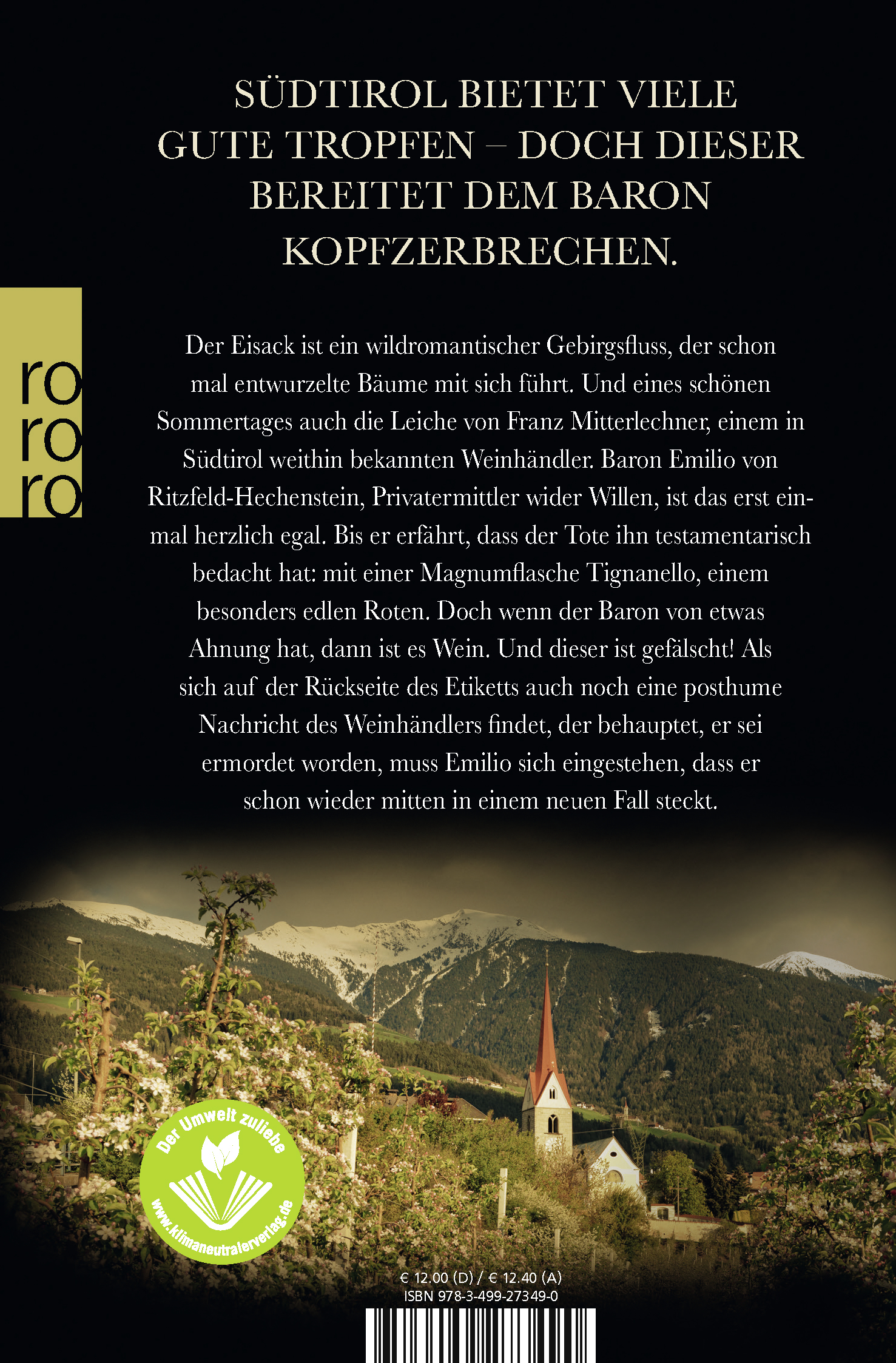 Der Eisack ist ein wildromantischer Gebirgsfluss, der schon mal entwurzelte Bäume mit sich führt. Und eines schönen Sommertages auch die Leiche von Franz Mitterlechner, einem in Südtirol weithin bekannten Weinhändler. Baron Emilio von Ritzfeld-Hechenstein, Privatermittler wider Willen, ist das erst einmal herzlich egal. Bis er erfährt, dass der Tote ihn testamentarisch bedacht hat: mit einer Magnumflasche Tignanello, einem besonders edlen Roten. Doch wenn der Baron von etwas Ahnung hat, dann ist es Wein. Und dieser ist gefälscht! Als sich auf der Rückseite des Etiketts auch noch eine posthume Nachricht des Weinhändlers findet, der behauptet, er sei ermordet worden, muss Emilio sich eingestehen, dass er schon wieder mitten in einem neuen Fall steckt.
