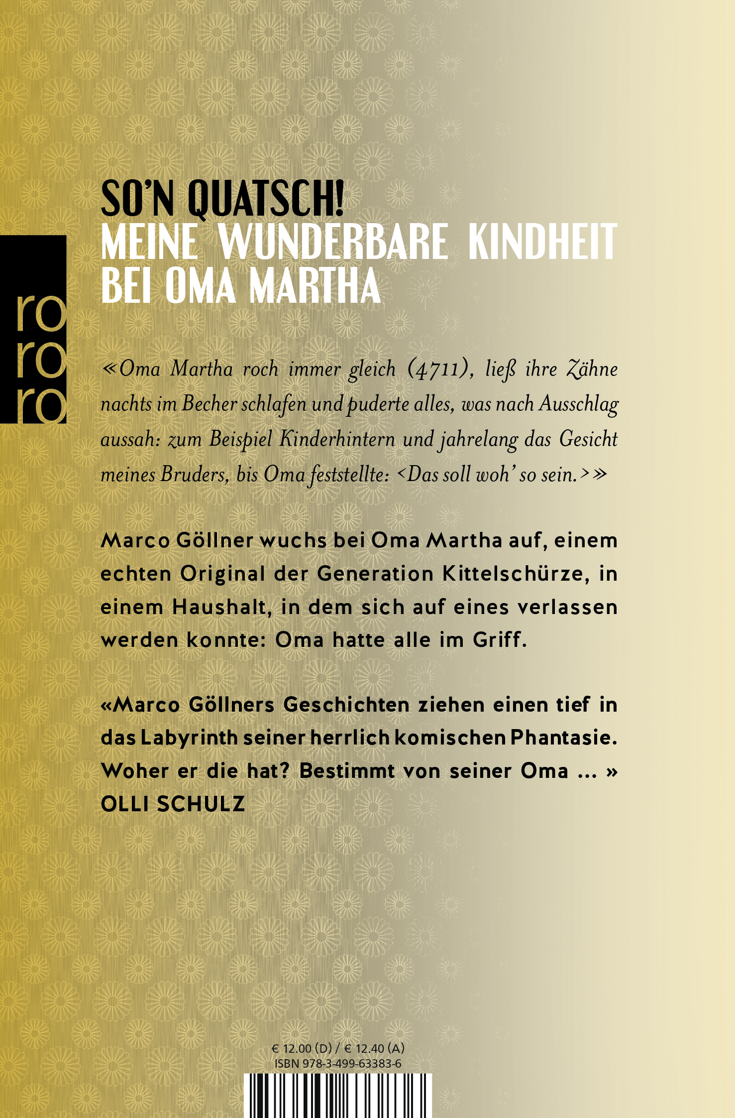 So'n quatsch! Meine wunderbare Kindheit bei Oma Martha«Oma Martha roch immer gleich (4711), ließ ihre Zähne nachts im Becher schlafen und puderte alles, was nach Ausschlag aussah: zum Beispiel Kinderhintern und jahrelang das Gesicht meines Bruders, bis Oma feststellte: 'Das soll woh' so sein.'»Marco Göllner wuchs bei Oma Martha auf, einem echten Original der Generation Kittelschürze, in einem Haushalt, in dem sich auf eines verlassen werden konnte: Oma hatte alle im Griff. «Marco Göllners Geschichten ziehen einen tief in das Labyrinth seiner herrlich komischen Phantasie. Woher er die hat? Bestimmt von seiner Oma ... »Olli Schulz
