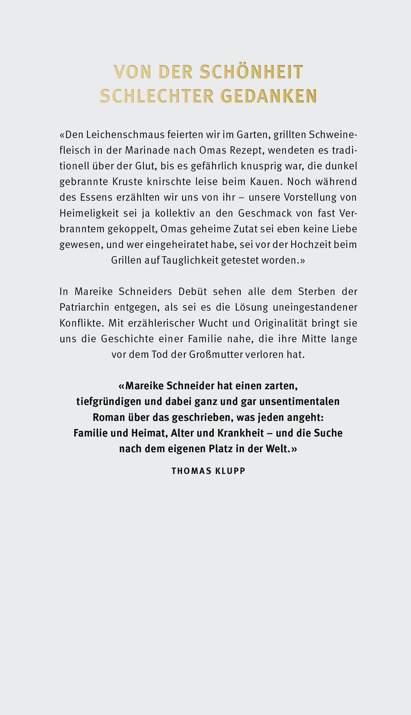 Mareike Schneider hat einen zarten, tiefgründigen und dabei ganz und gar unsentimentalen Roman über das geschrieben, was jeden angeht: Familie und Heimat, Alter und Krankheit - und die Suche nach dem eigenen Platz in der Welt.
