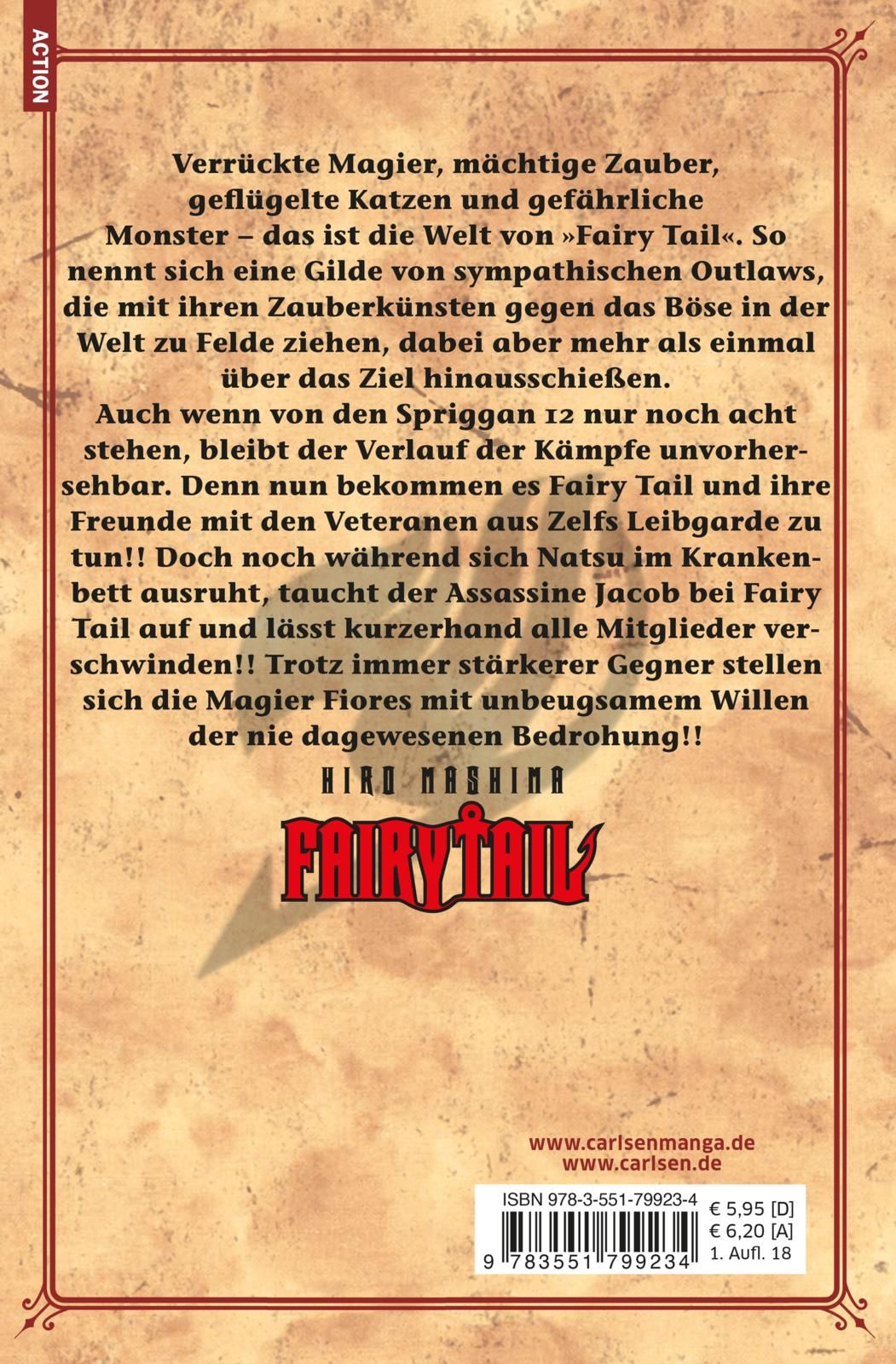 | Schlagworte | Abenteuer • action • action manga • Alternatives Universum • battle fighting fantasy • Bestseller Manga • Cool • Drachen • Drachentöter • dragon slayer • Einstiegsmanga • eLSA • episch • Erza • fairy • Fantasy • fantasy manga • Freundschaft • gilde abenteuer • Gray Fullbuster • Happy • Heroes • Hiro Mashima • Japanische Leserichtung • Kämpfe • Komödie • Lucy • Magie • Magier • Magiergilde • Manga • Manga ab 12 • Manga Abenteuer • manga assassine • Manga Heroes • manga magie • Natsu • Shonen Manga • Spaß • Wendy • zauberer fantasy |