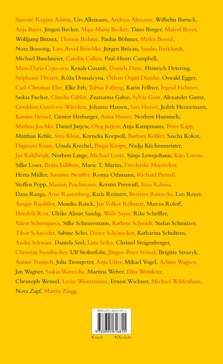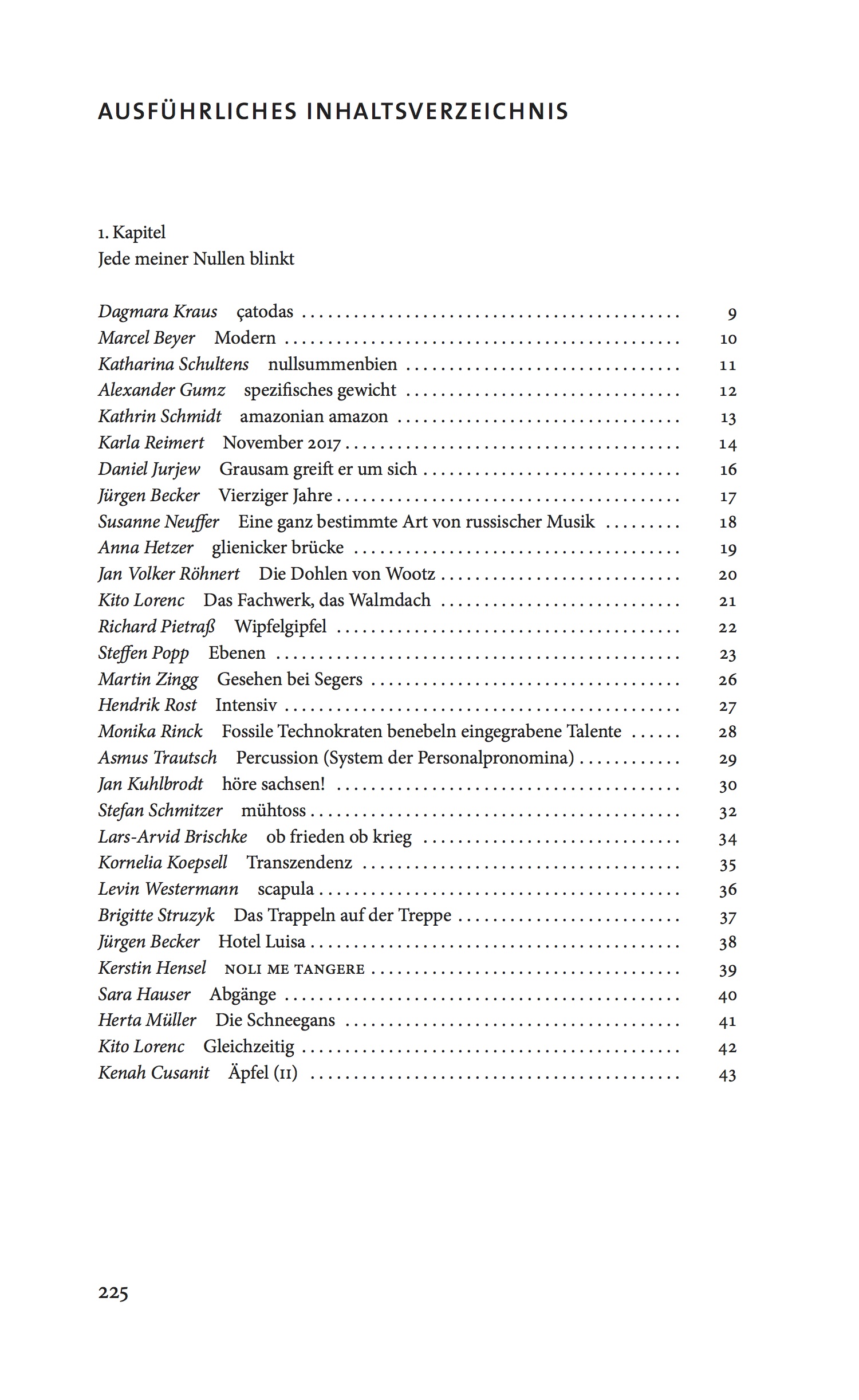 | Schlagworte | Auswahl • Carolin Callies • Cojocaru • Friederike Mayröcker • Gedichte • Gegenwart • Herta Müller • Ilma Rakusa • Jede meiner Nullen blinkt • Lyrik • Marcel Beyer • Marion Poschmann • Mirko Bonné • Oleg Jurjew • Sammlung • Silke Scheuermann • Ulrike Almut Sandig |