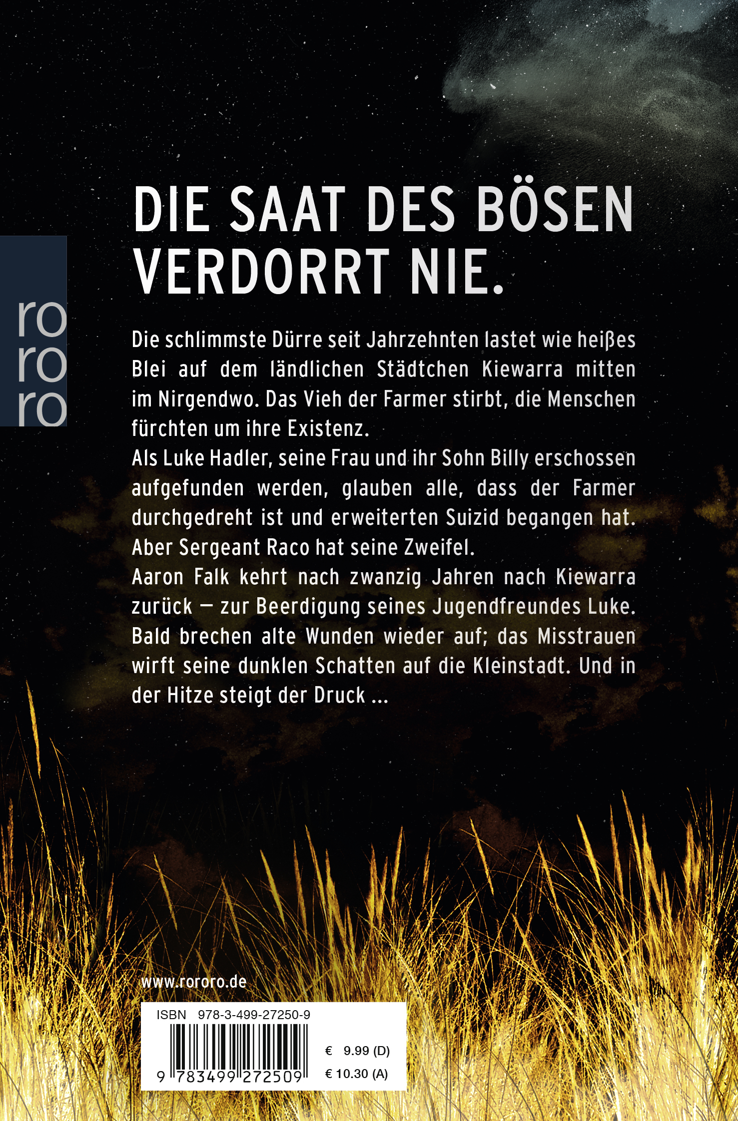 Aaron Falk kehrt nach zwanzig Jahren nach Kiewarra zurück - zur Beerdigung seines Jugendfreundes Luke. Bald brechen alte Wunden wieder auf; das Misstrauen wirft seine dunklen Schatten auf die Kleinstadt. Und in der Hitze steigt der Druck ...