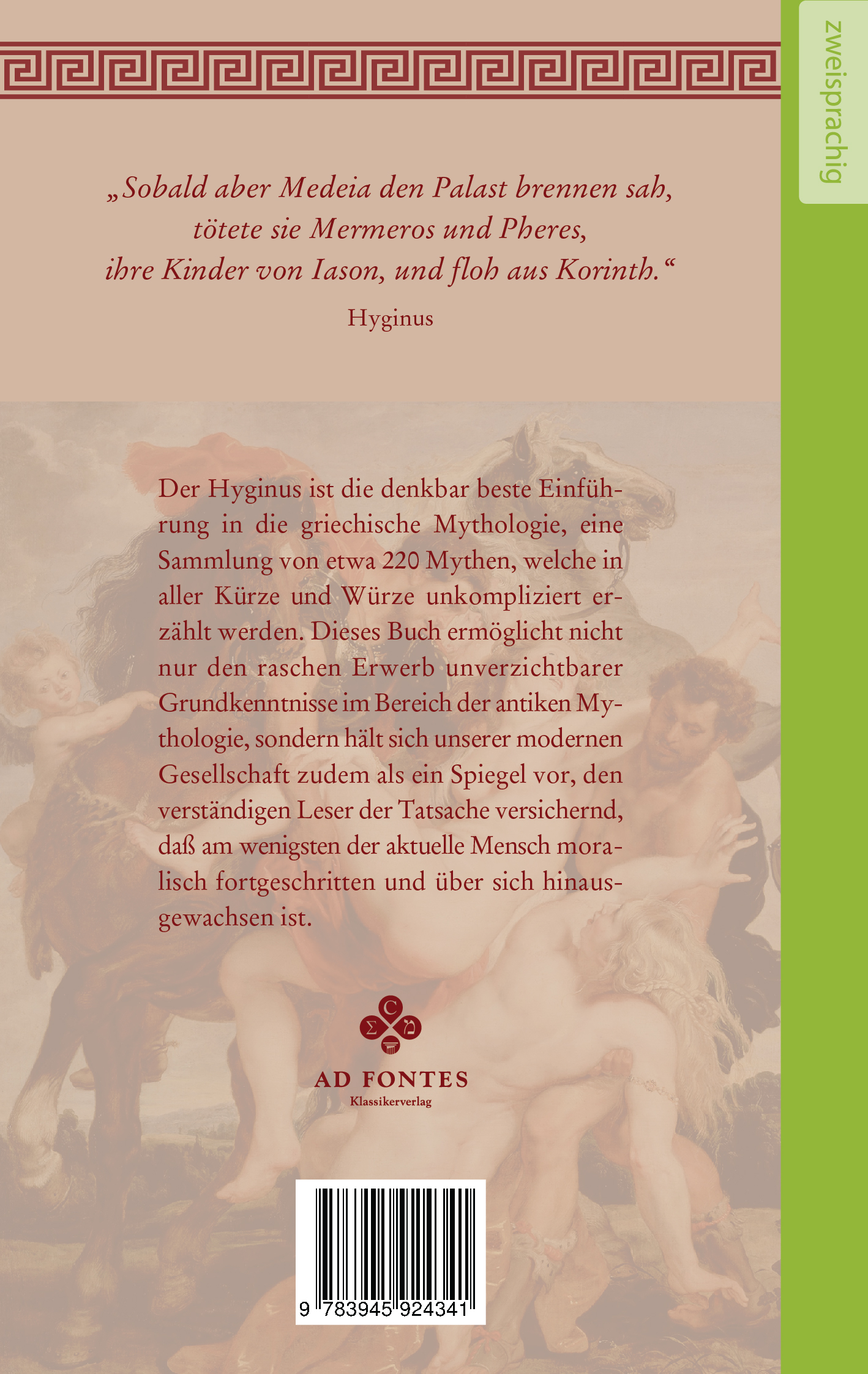 Gaius Iulius Hyginus (60 v. Chr. – 4 n. Chr.) war einer der bedeutenden Gelehrten und Grammatiker um Kaiser Augustus sowie ein Freund des Ovid, an dessen hochberühmte „Metamorphosen“ die „Fabulae“ als gleichsam vereinfachte Kurzfassung angelehnt sind. Hyginus hat seinen kulinarisch aufbereiteten Stoff aber auch aus griechischen Tragödien genommen und aus weiteren Quellen wie etwa der „Odyssee“ des Homer viele der bekanntesten griechischen Mythen geschöpft und in lateinischer Sprache präsentiert. Entstanden sind die „Fabulae“ wohl als Lehr- und Schulbuch für die Urenkel des Augustus, deren Erzieher Hyginus gewesen ist. Auch heute noch zählt dieses Büchlein daher zu den beliebtesten Haus- und Schullektüren.