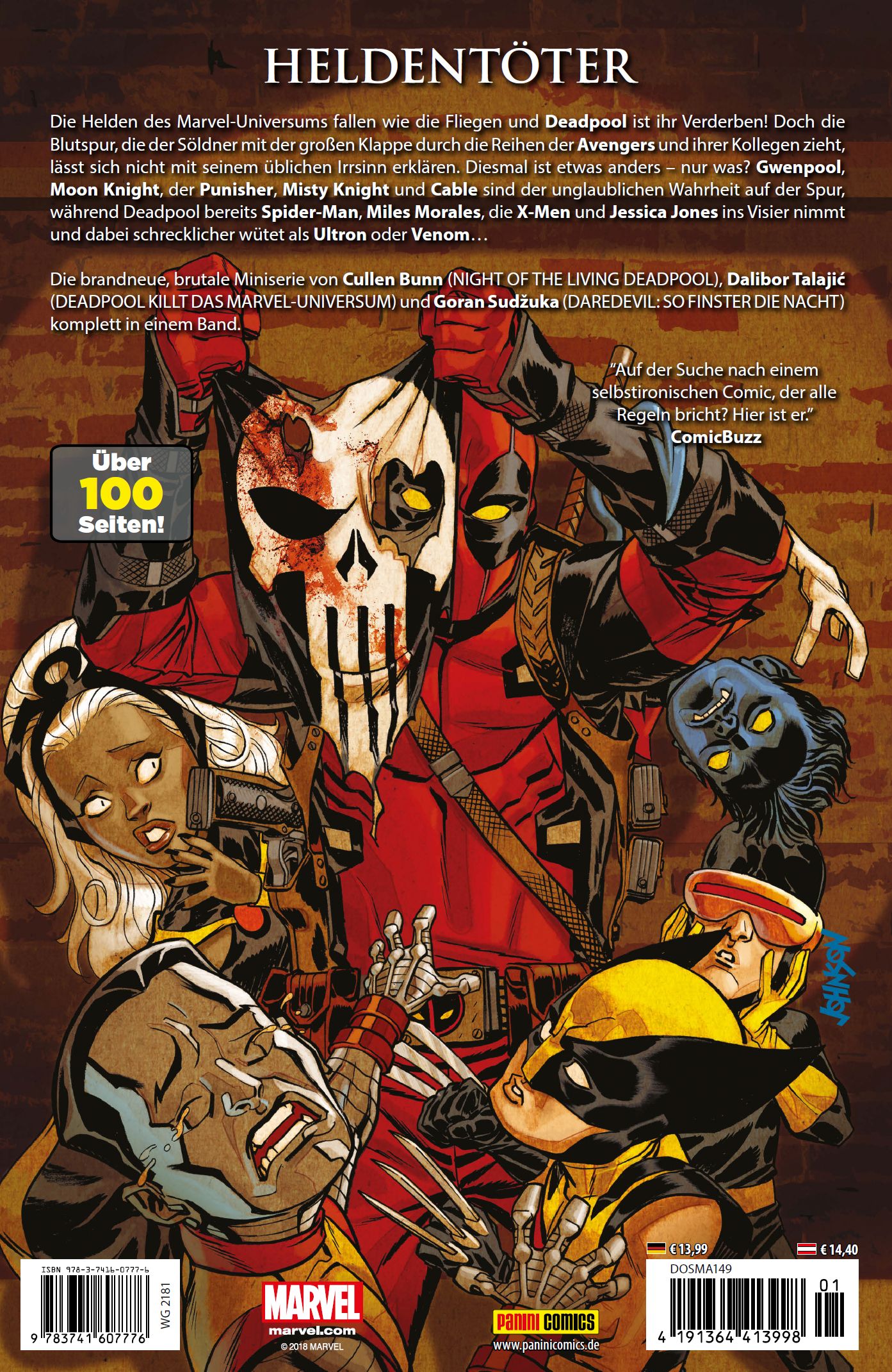 DER AUTOR Cullen Bunn darf man dagegen als einen der fleißigsten Deadpool-Autoren der letzten Jahre bezeichnen. Neben seinen vielen Miniserien, die Panini allesamt in Einzelbänden veröffentlicht und in denen er u. a. diverse literarische Klassiker sowie die Zombie-Kracher Night of the Living Dead und The Walking Dead als Deadpool-Geschichten parodierte, verfasste er zuletzt noch die Serie DEADPOOL & DIE SÖLDNER, die in der Marvel-Hauptrealität angesiedelt ist. Solo, Slapstick und Foolkiller aus dem ersten Band erlebten in einem fetten Megaband kürzlich übrigens schräge eigene Abenteuer. DIE ZEICHNER Der Kroate Dalibor Talajić studierte Musik, bevor er Comic-Zeichner wurde. Er steuerte Artwork zu X-MEN, DEADPOOL, DEADPOOL TEAM-UP, GEORGE A. ROMEROS EMPIRE OF THE DEAD, AVENGERS – LEGENDEN und AVENGERS bei. Sein Landsmann Goran Sudžuka lebt und arbeitet inzwischen in Berlin und veröffentlichte zunächst u. a. in der deutschen Comic-Reihe Gespenster Geschichten. Seither kamen Y: THE LAST MAN, JOHN CONSTANTINE – HELLBLAZER 4: LADY CONSTANTINE, GHOSTED, WOLVERINE, WONDER WOMAN und aktuell DAREDEVIL hinzu.