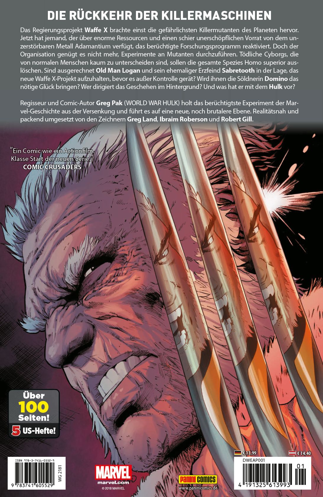DIE RÜCKKEHR DER KILLERMASCHINENDas Regierungsprojekt Waffe X brachte einst die gefährlichsten Killermutanten des Planeten hervor. Jetzt hat jemand, der über enorme Ressourcen und einen schier unerschöpflichen Vorrat von dem unzerstörbaren Metall Adamantium verfügt, das berüchtigte Forschungsprogramm reaktiviert. Doch der Organisation genügt es nicht mehr, Experimente an Mutanten durchzuführen. Tödliche Cyborgs, die von normalen Menschen kaum zu unterscheiden sind, sollen die gesamte Spezies Homo superior auslöschen. Sind ausgerechnet Old Man Logan und sein ehemaliger Erzfeind Sabretooth in der Lage, das neue Waffe X-Projekt aufzuhalten, bevor es außer Kontrolle gerät? Wird ihnen die Söldnerin Domino das nötige Glück bringen? Wer dirigiert das Geschehen im Hintergrund? Und was hat er mit dem Hulk vor?Regisseur und Comic-Autor Greg Pak (WORLD WAR HULK) holt das berüchtigtste Experiment der Marvel-Geschichte aus der Versenkung und führt es auf eine neue, noch brutalere Ebene. Realitätsnah und packend umgesetzt von den Zeichnern Greg Land, Ibraim Roberson und Robert Gill.