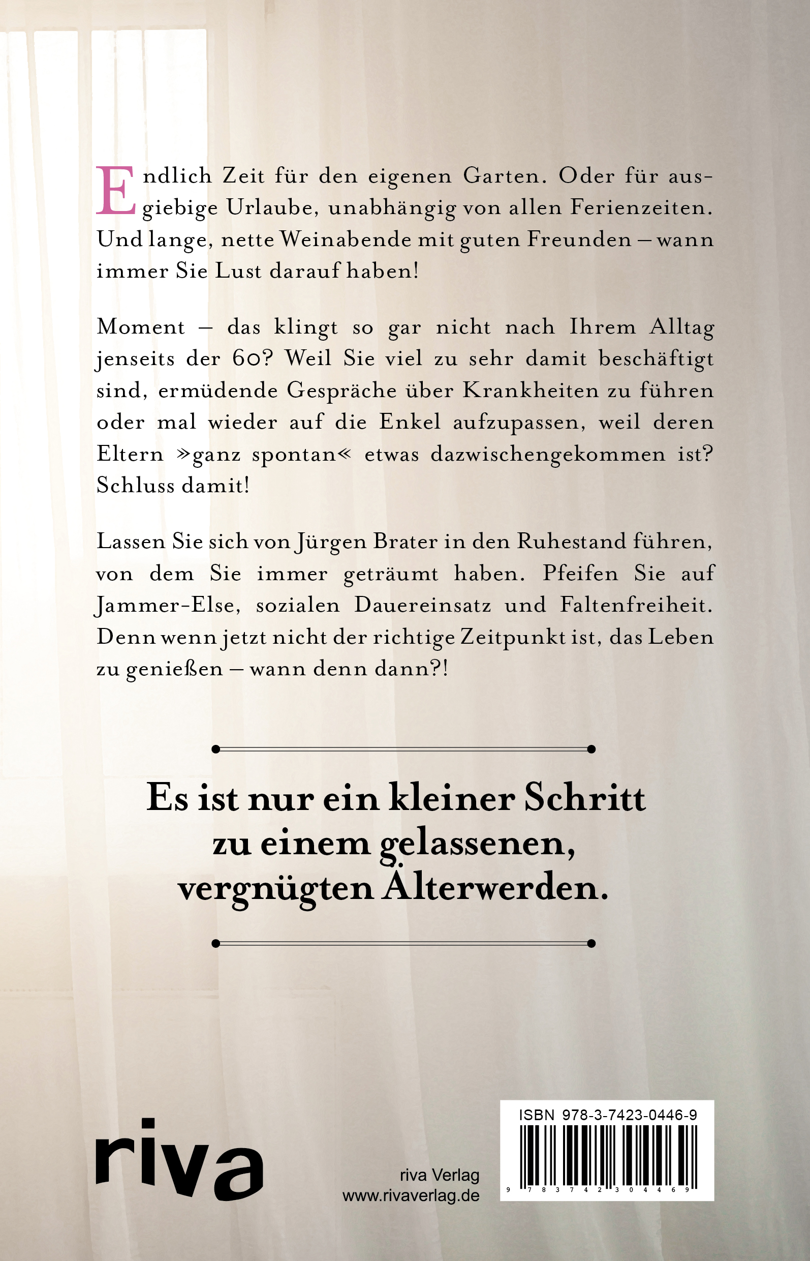 Endlich Zeit für den eigenen Garten. Oder für ausgiebige Urlaube, unabhängig von allen Ferienzeiten. Und lange, nette Weinabende mit guten Freunden - wann immer Sie Lust darauf haben! Moment - das klingt so gar nicht nach Ihrem Alltag jenseits der 60? Weil Sie viel zu sehr damit beschäftigt sind, ermüdende Gespräche über Krankheiten zu führen oder mal wieder auf die Enkel aufzupassen, weil deren Eltern »ganz spontan« etwas dazwischengekommen ist? Schluss damit!Lassen Sie sich von Jürgen Brater in den Ruhestand führen, von dem Sie immer geträumt haben. Pfeifen Sie auf Jammer-Else, sozialen Dauereinsatz und Faltenfreiheit.Denn wenn jetzt nicht der richtige Zeitpunkt ist, das Leben zu genießen - wann denn dann?!Es ist nur ein kleiner Schritt zu einem gelassenen, vergnügten Älterwerden.