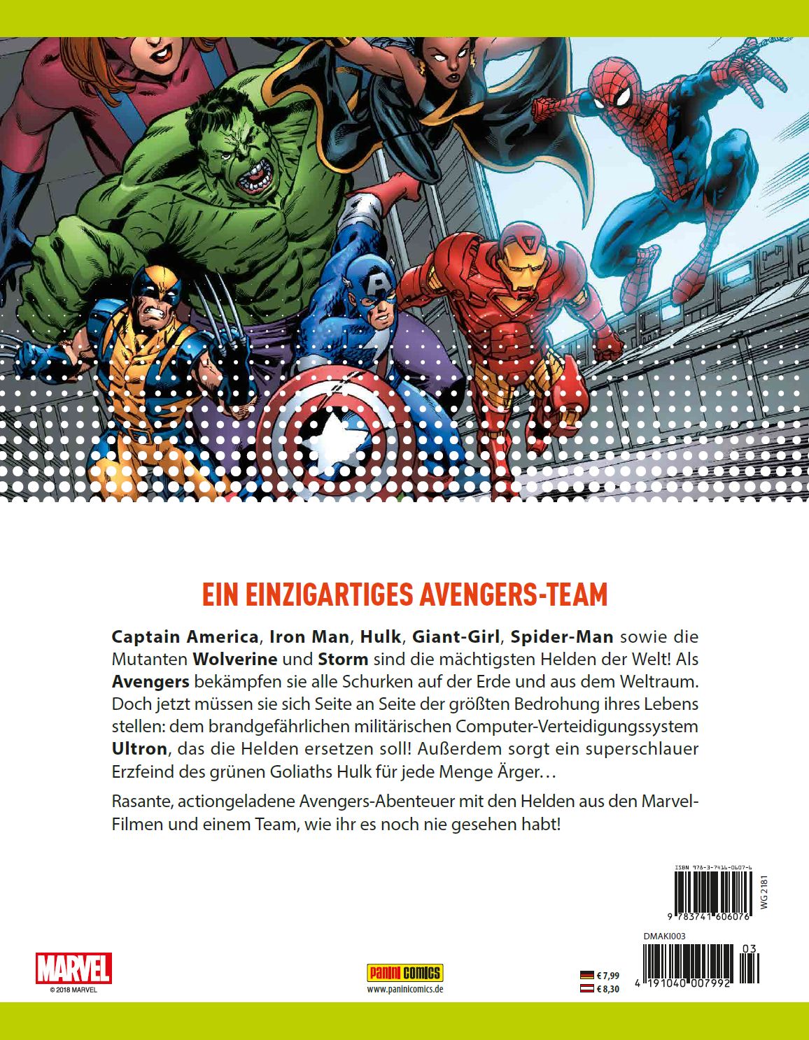 EIN EINZIGARTIGES AVENGERS-TEAMCaptain America, Iron Man, Hulk, Giant-Girl, Spider-Man sowie die Mutanten Wolverine und Storm sind die mächtigsten Helden der Welt! Als Avengers bekämpfen sie alle Schurken auf der Erde und aus dem Weltraum. Doch jetzt müssen sie sich Seite an Seite der größten Bedrohung ihres Lebens stellen: dem brandgefährlichen militärischen Computer-Verteidigungssystem Ultron, das die Helden ersetzen soll! Außerdem sorgt ein superschlauer Erzfeind des grünen Goliaths Hulk für jede Menge Ärger...Rasante, actiongeladene Avengers-Abenteuer mit den Helden aus den Marvel-Filmen und einem Team, wie ihr es noch nie gesehen habt!