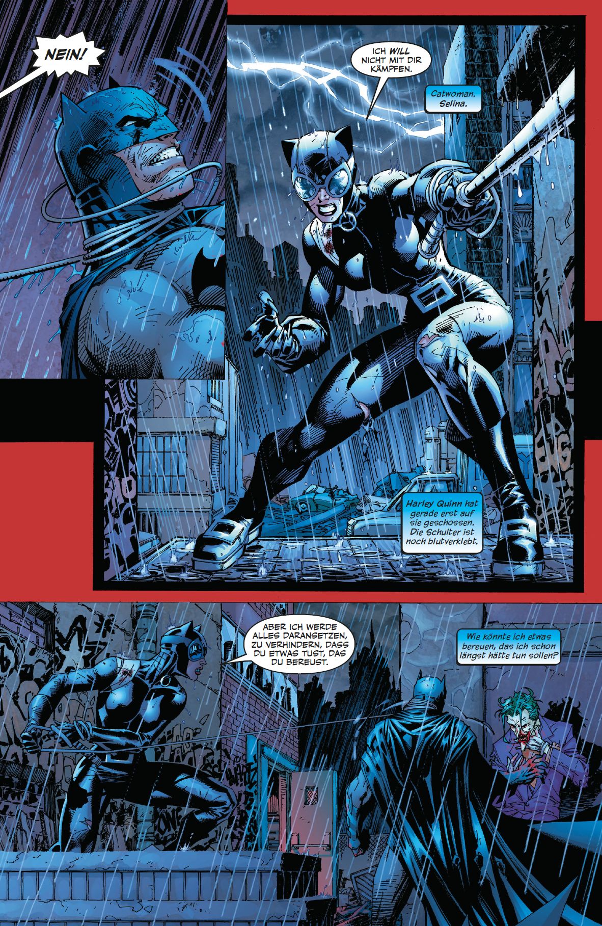 DAS VERWIRRSPIEL NÄHERT SICH SEINEM HÖHEPUNKT von Jürgen Zahn Nachdem Batman einen entführten Jungen aus den Klauen von Killer Croc befreit hat, taucht Catwoman auf und verschwindet mit dem Lösegeld. [...] Im Verlauf des ersten Teils von HUSH wird der ganze Fall für Bruce Wayne immer persönlicher und Batman muss sich vor allem mit seiner “Familie“, aber auch mit seiner neuen Freundin Catwoman auseinandersetzen. Doch neben diesen amourösen Verwicklungen tritt vor allem ein Gefühl in den Vordergrund: Angst. Die Angst, einen geliebten Menschen zu verlieren. Die Angst hilflos zu sein. Als kleiner Junge konnte Bruce Wayne den Mord an seinen Eltern nicht verhindern. Ein traumatisches Ereignis, das den Jungen zu Batman gemacht hat, dem Mann, der bis heute versucht, diese brutale Tat durch den Kampf gegen das Verbrechen zu verarbeiten. Der Anschlag des Jokers auf Batgirl und die Ermordung von Jason Todd – ebenfalls durch den Joker – haben Batman wieder in die gleiche Lage versetzt. Er war hilflos. Das Verbrechen hatte gesiegt und für einen Moment hat der Dunkle Ritter seine Ideale infrage gestellt. Es ist der Augenblick, in dem Batman bereit ist, den schmalen Grat zwischen Gesetz und Verbrechen, auf dem er wandelt, zu verlassen und selbst zum Mörder zu werden. Es ist der Augenblick, der ihn menschlich macht, aber auch sehr verletzlich und hilflos. Es ist der Augenblick, der ihn zweifeln lässt und in dem er sich erneut für die richtige Seite entscheiden muss – der Augenblick, in dem er erneut zu Batman wird.