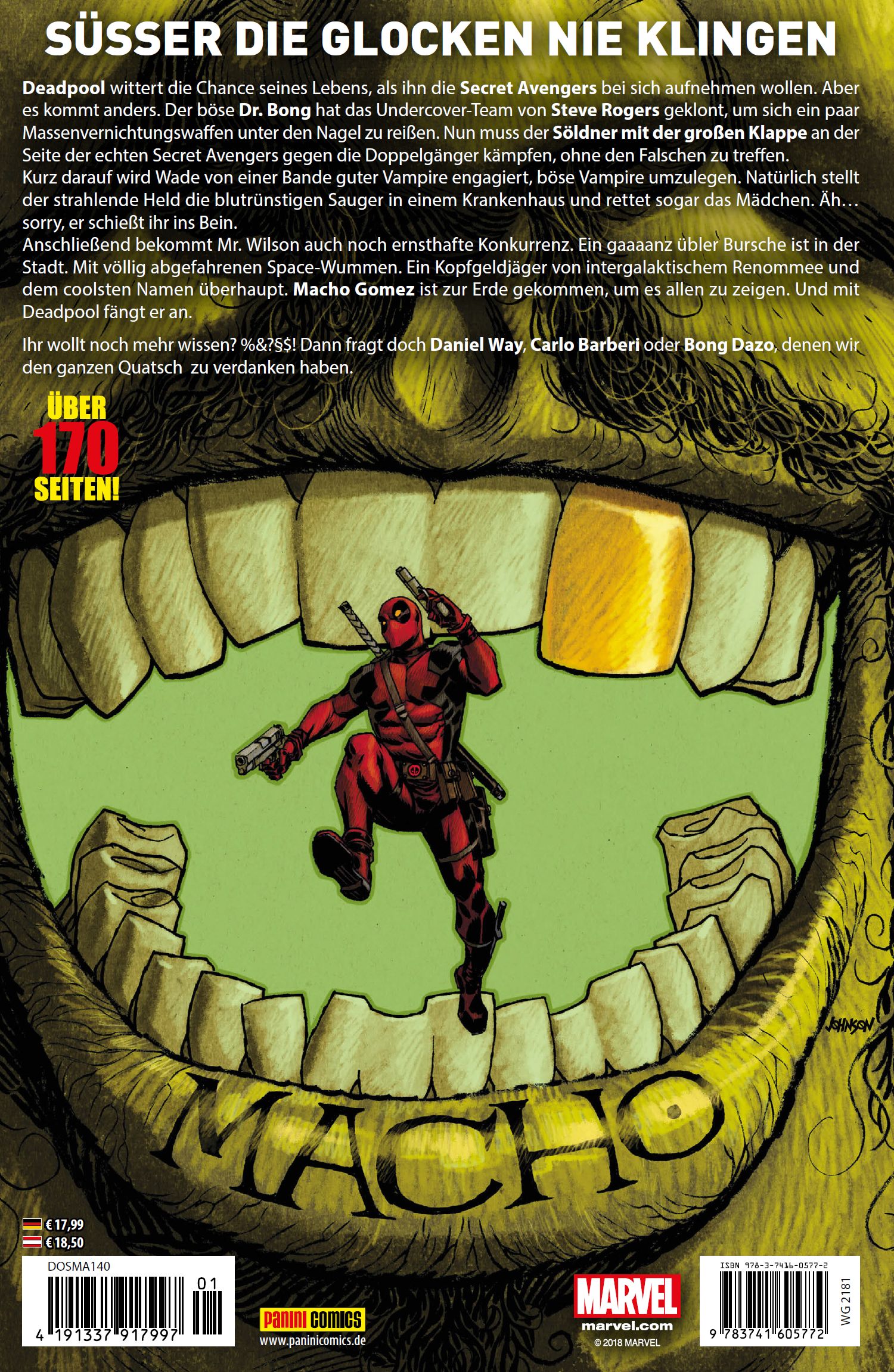 DANIEL WAY 1974 in Michigan geboren, brachte Daniel Way mit 26 Jahren seinen ersten Comic Violent Lifestyle heraus. Mit dem Netzkopf startete 2002 seine Marvel-Karriere in der Serie Spider-Man‘s Tangled Web. Sechs Jahre lang machte sich der US-Autor mit Titeln wie GHOST RIDER, HULK und WOLVERINE einen Namen, bevor er von 2008 bis 2012 Deadpools gesamte zweite, fortlaufende Serie zu Papier brachte. Way lebte, dachte und fühlte wie Deadpool. Zuviel für seine Nerven. Nachdem er den Söldner mit der großen Klappe 2013 in die Thunderbolts integriert hatte, machte sich der US-Autor Hals über Kopf aus dem Staub und stürzte sich in Indie-Projekte wie die Horrorreihe CROSSED von Garth Ennis oder EVE: True Stories, ein Comic über das gleichnamige Online-Spiel. Nur mit Engelszungen konnte er für ein Comeback zu Wades Hochzeitsausgabe reaktiviert werden. Pool-geschädigt versucht er sich mittlerweile an abgefahrenen Eigenproduktionen wie Kill-Crazy Nymphos Attack!. Ende 2016 ist bei Dark Horse nach 13 Jahren Pause endlich der Abschluss seiner Miniserie Gun Theory erschienen. CARLO BARBERI Der Mexikaner Carlo Barberi ist bereits seit den 90ern im Geschäft. 1972 in Monterrey zur Welt gekommen, entdeckte er früh eine Affinität fürs Zeichnen. 1996 ermöglichte ihm Dark Horse den Einstieg in die US-Branche. Dort war er maßgeblich an der Entstehung der Figur Saint Slayer beteiligt. Nach zwei Jahren wechselte er zu DC, wo er vor allem Comics zu gleichnamigen TV-Serien wie BATMAN: THE BRAVE AND THE BOLD und Justice League Unlimited (Dt.: Liga der Gerechten) umsetzte. Insbesondere sorgte er mit Impulse für Furore. 2006 ernannte ihn Wildstorm zum Hauptzeichner von Gen13. Jahre später übernahm Barberi erstmals Jobs für Marvel, darunter New Mutants oder die Miniserie Ororo: Before the Storm. In jüngerer Zeit steigerte der Altmeister seine Bekanntheit mit Titeln wie AMAZING X-MEN, SCARLET SPIDER und natürlich DEADPOOL. Zuletzt arbeitete er u. a. an GUARDIANS OF INFINITY, X-MEN und MONSTERS UNLEASHED – DIE MONSTER SIND LOS. BONG DAZO Der Zeichner Angelo Ty Dazo wurde auf den Philippinen geboren, wo er zunächst Illustrationen für die Textilund Modebranche sowie Layouts für Zeichentrickfilme anfertigte. Ende der 80er gehörte er zu den ersten Zeichnern, die das US-Publikum mit Mangas vertraut machten. Unter dem Namen Bong Dazo gestaltete er ab 2007 mehrere Star Wars-Ausgaben für Dark Horse. Da ihn Marvel-Comics inspiriert hatten, Künstler zu werden, erfüllte sich ein Kindheitstraum, als ihn das Haus der Ideen für Titel wie Thunderbolts engagierte. Die zweibändige Reihe DEADPOOL: DER SÖLDNER MIT DER GROSSEN KLAPPE machte ihn auch hierzulande schlagartig bekannt. Dazo ist ein Meister alter Schule, der zahlreiche Zeichenstile beherrscht. Mit Autor Scott Rosenberg brachte er von 2015 bis 2016 die eigene Miniserie Bad Moon Rising heraus, ein Mix aus Der Wolfsmensch und Sons of Anarchy. 2016 erschien in Zusammenarbeit mit Mike Horan zudem die Miniserie Æther & Empire, eine Hommage an das viktorianische Zeitalter und Jules Verne. Sein neuester Clou ist ein innovativer Indie-Titel über die Probleme von Sidekicks namens Side-Kicked.