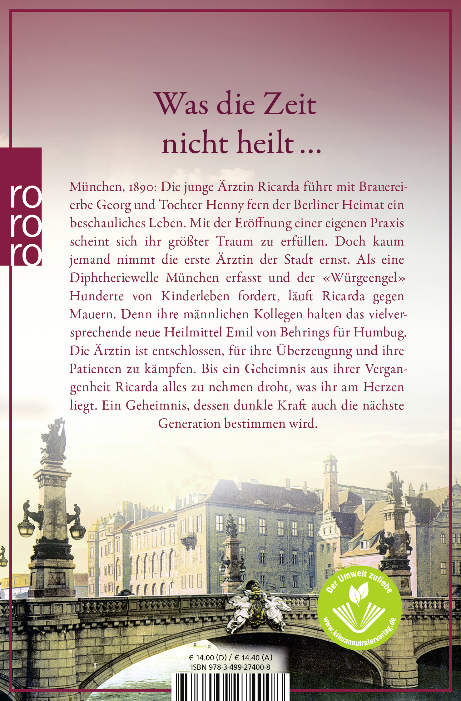 München, 1890: Die junge Ärztin Ricarda führt mit Brauereierbe Georg und Tochter Henny fern der Berliner Heimat ein beschauliches Leben. Mit der Eröffnung einer eigenen Praxis scheint sich ihr größter Traum zu erfüllen. Doch kaum jemand nimmt die erste Ärztin der Stadt ernst. Als eine Diphteriewelle München erfasst und der 'Würgeengel' Hunderte von Kinderleben fordert, läuft Ricarda gegen Mauern. Denn ihre männlichen Kollegen halten das vielversprechende neue Heilmittel Emil von Behrings für Humbug. Die Ärztin ist entschlossen, für ihre Überzeugung und ihre Patienten zu kämpfen. Bis ein Geheimnis aus ihrer Vergangenheit Ricarda alles zu nehmen droht, was ihr am Herzen liegt. Ein Geheimnis, dessen dunkle Kraft auch die nächste Generation bestimmen wird.
