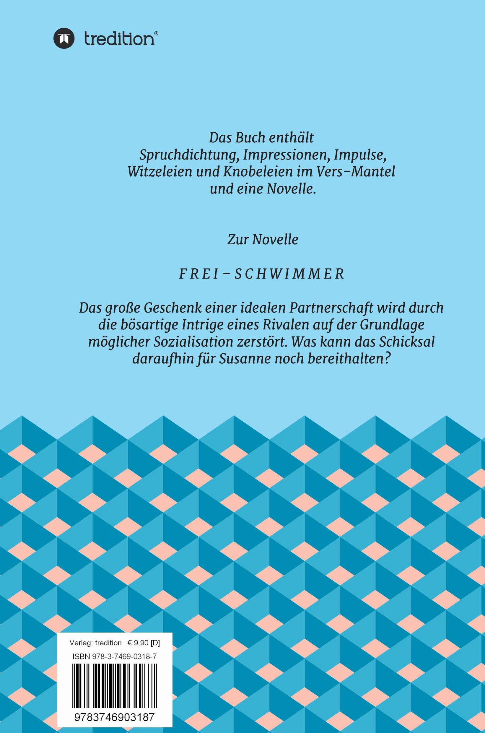 Das Buch enthält Spruchdichtung, Impressionen, Impulse, Witzeleien und Knobeleien im Vers-Mantel und eine Novelle.Zur Novelle: F r e i - S c h w i m m e rDas große Geschenk einer idealen Partnerschaft wird durch die bösartige Intrige eines Rivalen auf der Grundlage möglicher Sozialisation zerstört. Was kann das Schicksal daraufhin für Susanne noch bereithalten?