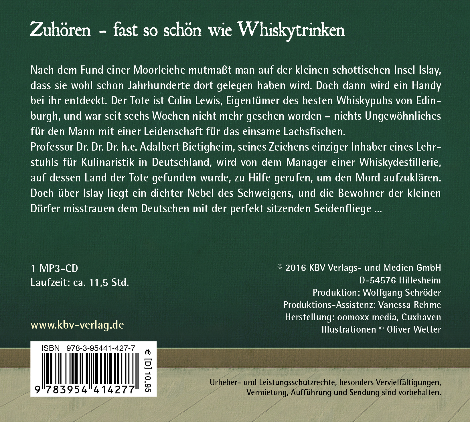 Zuhören - fast so schön wie WhiskytrinkenNach dem Fund einer Moorleiche mutmaßt man auf der kleinen schottischen Insel Islay, dass sie wohl schon Jahrhunderte dort gelegen haben wird. Doch dann wird ein Handy bei ihr entdeckt. Der Tote ist Hamish Macallan, Eigentümer der besten Whiskybar Edinburghs, und war seit sechs Wochen nicht mehr gesehen worden - nichts Ungewöhnliches für den Mann mit einer Leidenschaft für das einsame Lachsfischen. Professor Dr. Dr. Adalbert Bietigheim, seines Zeichens einziger Inhaber eines Lehrstuhls für Kulinaristik in Deutschland, wird von dem Manager einer Whiskydestillerie, auf dessen Land der Tote gefunden wurde, zu Hilfe gerufen, um den Mord aufzuklären. Doch über Islay liegt ein dichter Nebel des Schweigens, und die Bewohner der kleinen Dörfer misstrauen dem Deutschen mit der perfekt sitzenden Seidenfliege ...