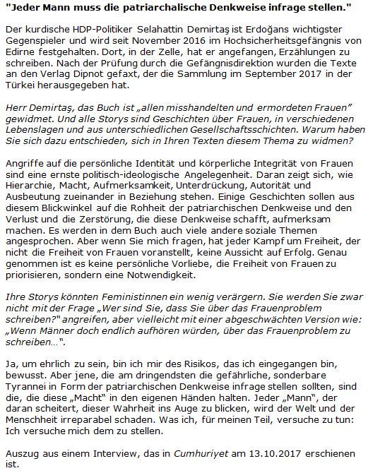 »Sehr eindrücklich skizziert Selahattin Demirtaş in seinen Geschichten die wunden Punkte der Gesellschaft in der Türkei. Geprägt von einem zutiefst demokratischen und emanzipatorischen Grundverständnis, zwingt er seine Leserinnen und Leser zur Auseinandersetzung mit blinden Flecken wie den stillen Schicksalen von Frauen und Mädchen. Damit stellt Demirtaş erneut unter Beweis, dass er einer der wichtigsten politischen Denker der Türkei ist.«
