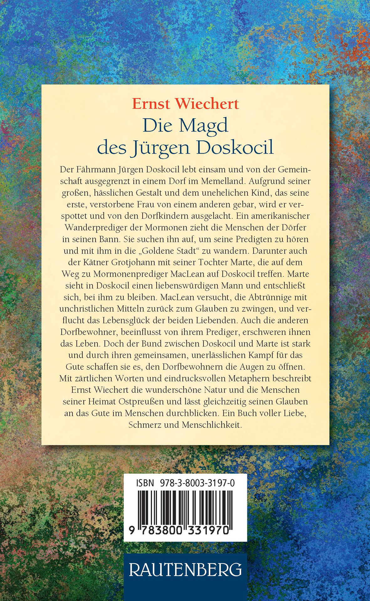 Ernst Wiechert wurde am 18. Mai 1887 im Forsthaus Kleinort in Ostpreußen geboren und zählt zu den meistgelesenen deutschen Schriftstellern der Nachkriegszeit. Den Ersten Weltkrieg machte er in Russland und Frankreich mit. Bis 1933 war er im höheren Schuldienst in Königsberg und Berlin tätig. 1933 ließ er sich in Bayern nieder. Wegen offenen Widerstandes war er zeitweise im Konzentrationslager Buchenwald inhaftiert. Zu seinen wichtigsten Werken zählen, neben dem Roman „Die Magd des Jürgen Doskocil“, die Romane „Die Majorin“, „Das einfache Leben“, „Missa sine nomine“, „Die Jeromin-Kinder“, die beiden Erinnerungsbände „Wälder und Menschen“, „Jahre und Zeiten“, seine Märchen, die Novellenbände „Die Flöte des Pan“, „Das heilige Jahr“, „Die Totenmesse“, „Hirtennovelle“, „Der weiße Büffel“ sowie die autobiografischen Aufzeichnungen „Der Totenwald“. Der Dichter starb am 24. August 1950 auf dem Rütihof in Uerikon in der Schweiz.
