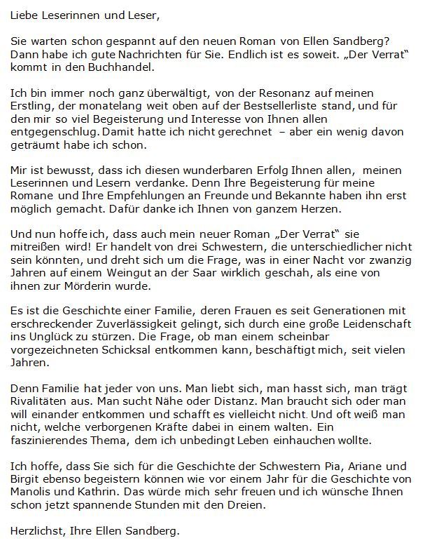 Ellen Sandberg ist das Pseudonym einer erfolgreichen Münchner Autorin. Sie arbeitete zunächst in der Werbebranche, ehe sie sich ganz dem Schreiben widmete. Ihr erster Roman »Die Vergessenen« stand monatelang ganz oben auf der Bestsellerliste und begeisterte Leser und die Presse. »Der Verrat« ist Ellen Sandbergs zweiter groß angelegter Spannungs- und Familienroman.