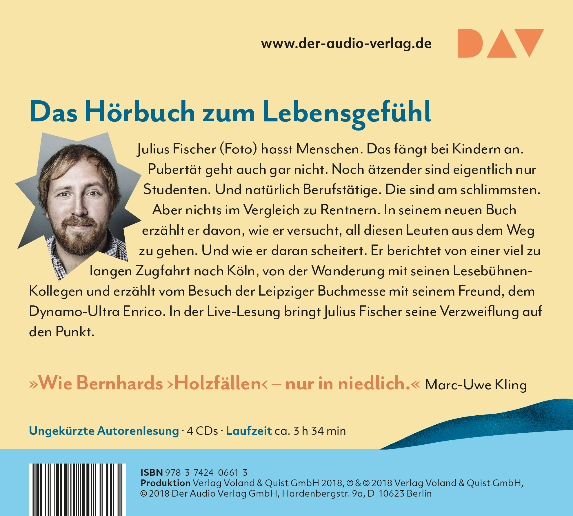 Julius Fischer hasst Menschen. Das fängt bei Kindern an. Pubertät geht auch gar nicht. Noch ätzender sind eigentlich nur Studenten. Und natürlich Berufstätige. Die sind am schlimmsten. Aber nichts im Vergleich zu Rentnern. In seinem neuen Buch erzählt er davon, wie er versucht, all diesen Leuten aus dem Weg zu gehen. Und wie er daran scheitert. Er berichtet von einer viel zu langen Zugfahrt nach Köln, von der Wanderung mit seinen Lesebühnen-Kollegen und erzählt vom Besuch der Leipziger Buchmesse mit seinem Freund, dem Dynamo-Ultra Enrico. In der Live-Lesung bringt Julius Fischer seine Verzweiflung auf den Punkt.Ungekürzte Live-Lesung mit Julius Fischer4 CDs | ca. 3 h 34 min