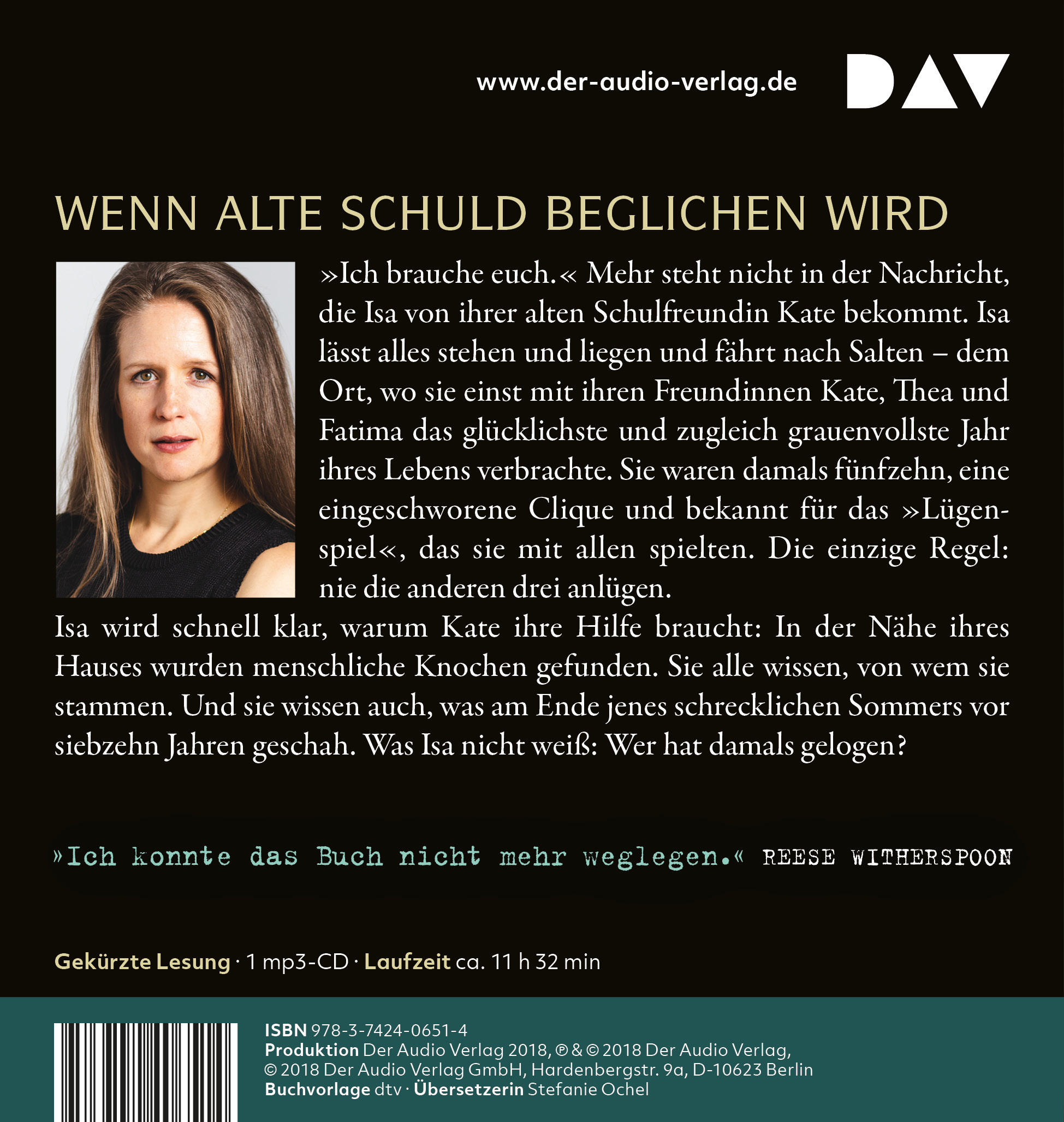 Auf dem Salten House-Internat waren Kate, Fatima, Thea und Isa die engsten Freundinnen. Die Spezialität der eingeschworenen Clique: Lehrer und Mitschüler durch das so genannte »Lügenspiel« in die Verzweiflung zu treiben, bei dem nur eine einzige Regel galt: Niemals eine der anderen anlügen. Jahre später erreicht Isa ein Hilferuf von Kate: Am Fluss neben ihrem Haus in Salten wurden menschliche Überreste gefunden – und alle vier Frauen ahnen, was dahinter steckt. Denn vor all den Jahren, nach jenem besonderen Sommer, gingen sie nicht ohne Grund auseinander…