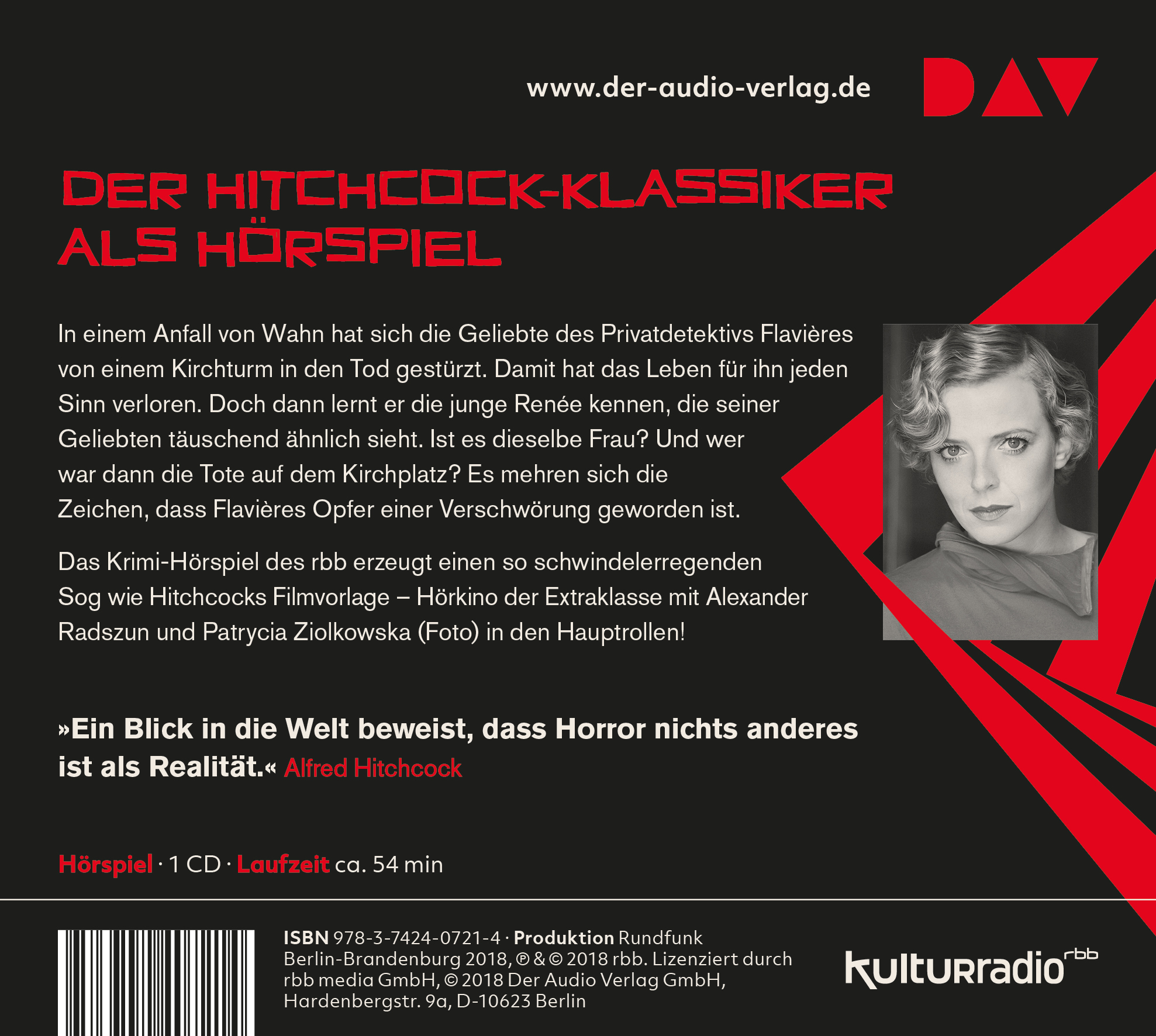 In einem Anfall von Wahn hat sich die Geliebte des Privatdetektivs Flavière von einem Kirchturm in den Tod gestürzt. Damit hat das Leben für ihn jeden Sinn verloren. Das ändert sich, als er die junge Renée kennenlernt, die seiner Geliebten täuschend ähnlich sieht. Ist es dieselbe Frau? Und wer war dann die Tote auf dem Kirchplatz? Es mehren sich die Zeichen, dass Flavière Opfer einer Verschwörung geworden ist. Das Krimi-Hörspiel des rbb erzeugt einen so schwindelerregenden Sog wie Hitchcocks Filmvorlage - Hörkino der Extraklasse mit Alexander Radszun und Patrycia Ziolkowska in den Hauptrollen!Hörspiel mit Matthias Scherwenikas, Alexander Radszun, Patrycia Ziolkowska, Michael Rotschopf1 CD | ca. 54 min
