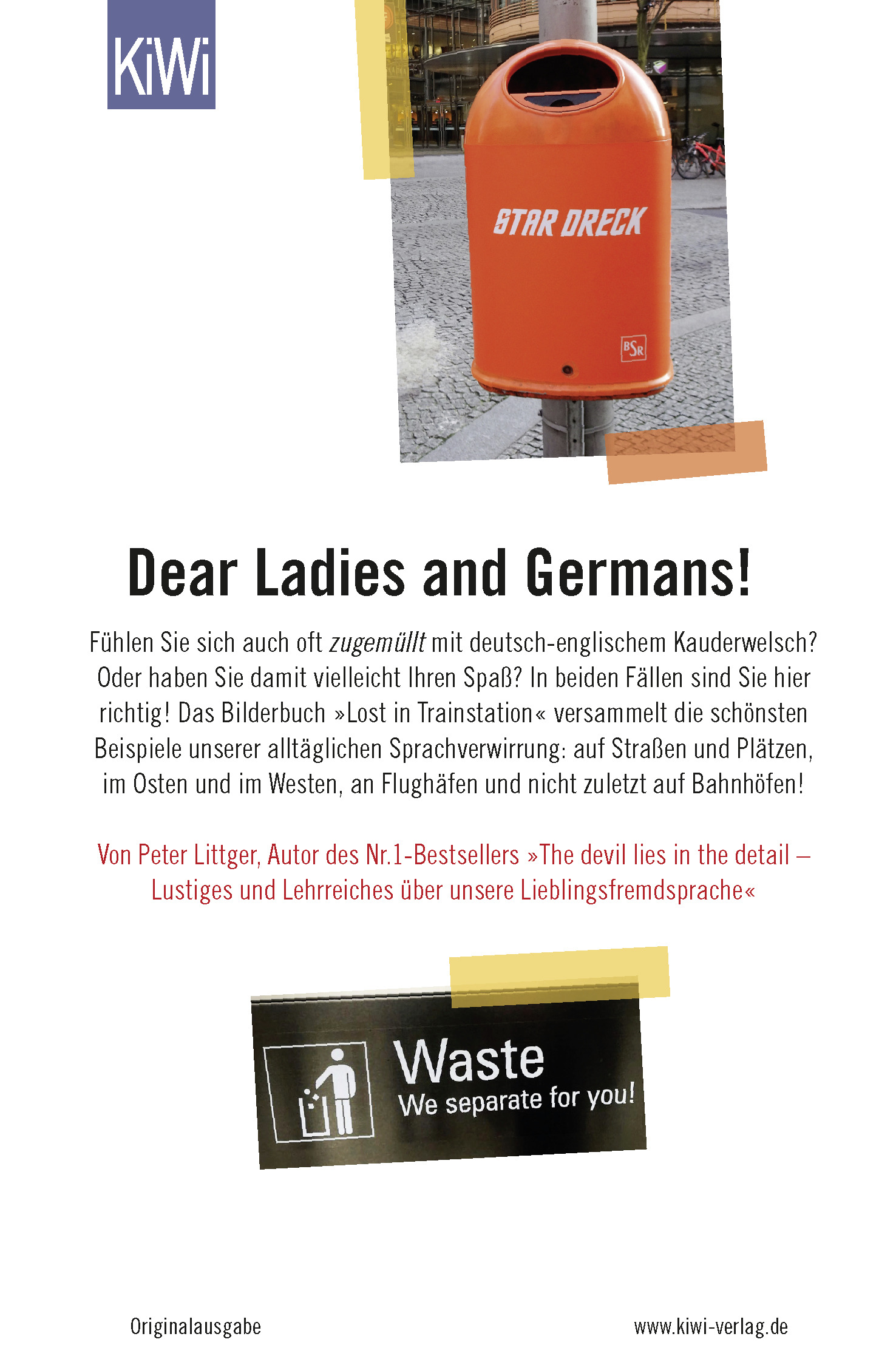 Fühlen Sie sich auch oft zugemüllt mit deutsch-englischem Kauderwelsch? Oder haben Sie damit vielleicht Ihren Spaß? In beiden Fällen sind Sie hier richtig! Das Bilderbuch »Lost in Trainstation« versammelt die schönsten Beispiele unserer alltäglichen Sprachverwirrung: auf Straßen und Plätzen, im Osten und im Westen, an Flughäfen und nicht zuletzt auf Bahnhöfen!