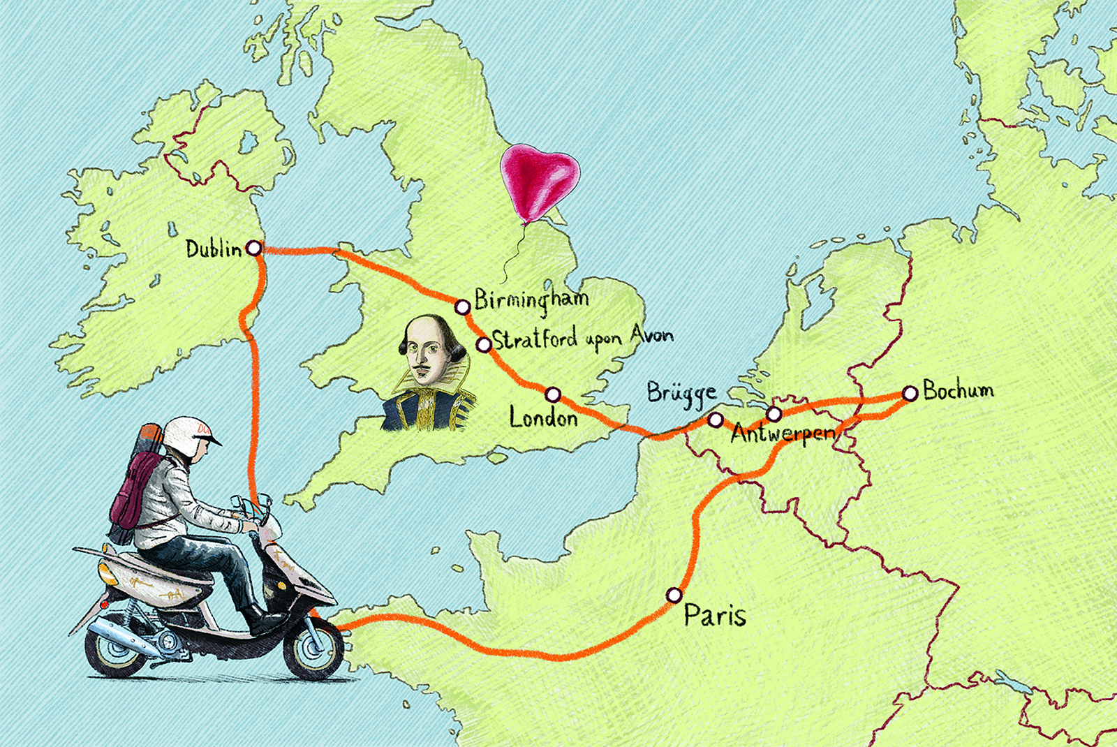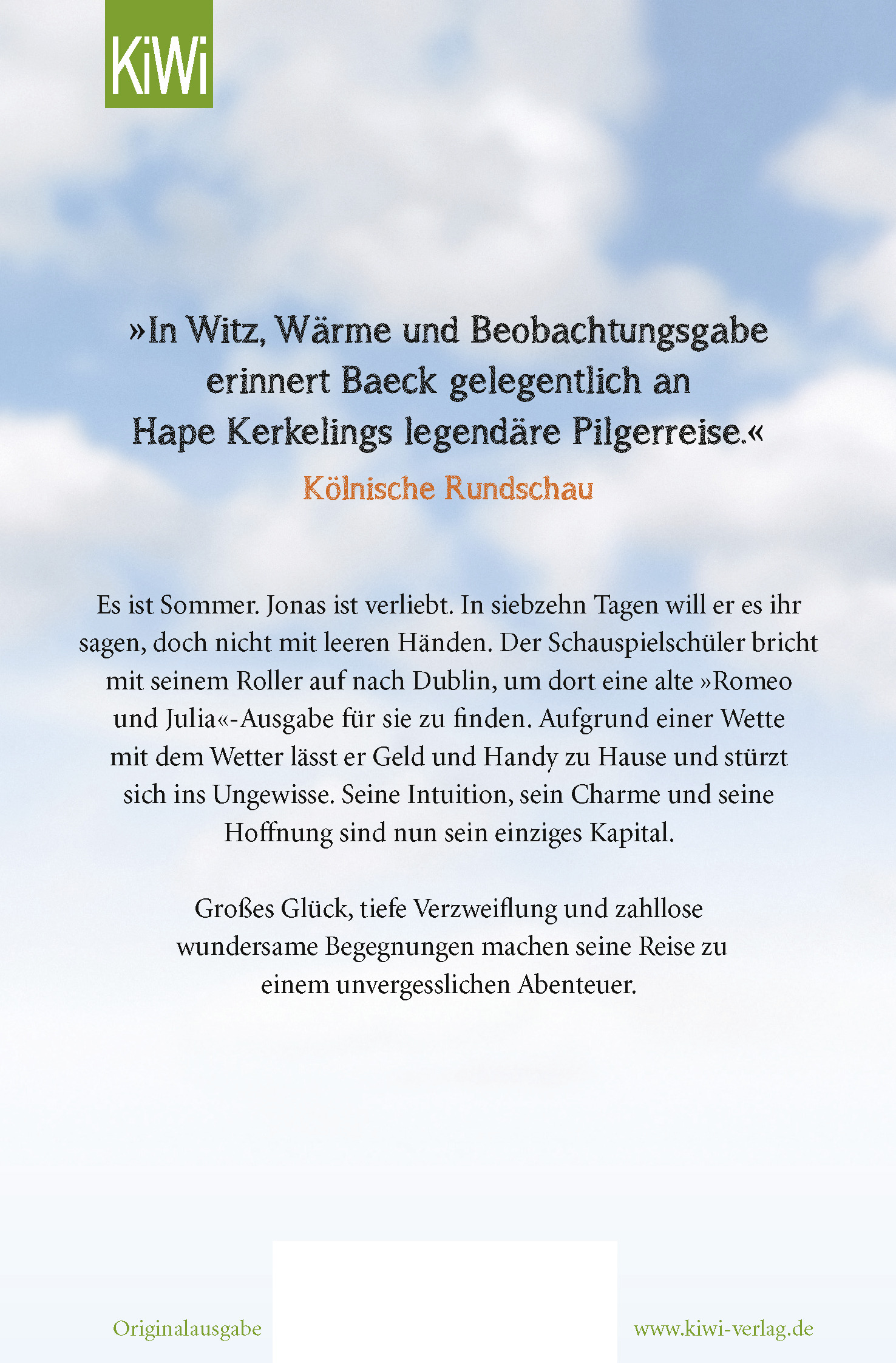 Als 23-jähriger Schauspielschüler verliebt sich Jonas Baeck Hals über Kopf in eine Kommilitonin - auf der Bühne, bei Romeo und Julia. Zu Beginn der Sommerferien fasst er einen ebenso verrückten wie romantischen Plan: eine Reise mit dem Roller nach Dublin. Als Liebesbeweis will er seiner Julia eine alte Shakespeare-Ausgabe mitbringen. Und als wäre das noch nicht genug, beschließt er: Wenn bis zu seiner Abfahrt die Sonne rauskommt, bleiben Geld und Handy zu Hause. Unterwegs begegnet er großzügigen Tankwarten, skurrilen Straßenmusikern, neuen Freunden, immer wieder dem großen William und nicht zuletzt sich selbst. Momente des Glücks und der Verzweiflung erwarten ihn - und unzählige Abenteuer. So spielt, singt und schmachtet er sich durch Europa und vollbringt Taten, die nicht auszudenken sind. Jonas Baeck erzählt von den wundersamen Dingen, die einem widerfahren können, wenn man das Geld zu Hause lässt und auf die eigene Intuition vertraut.