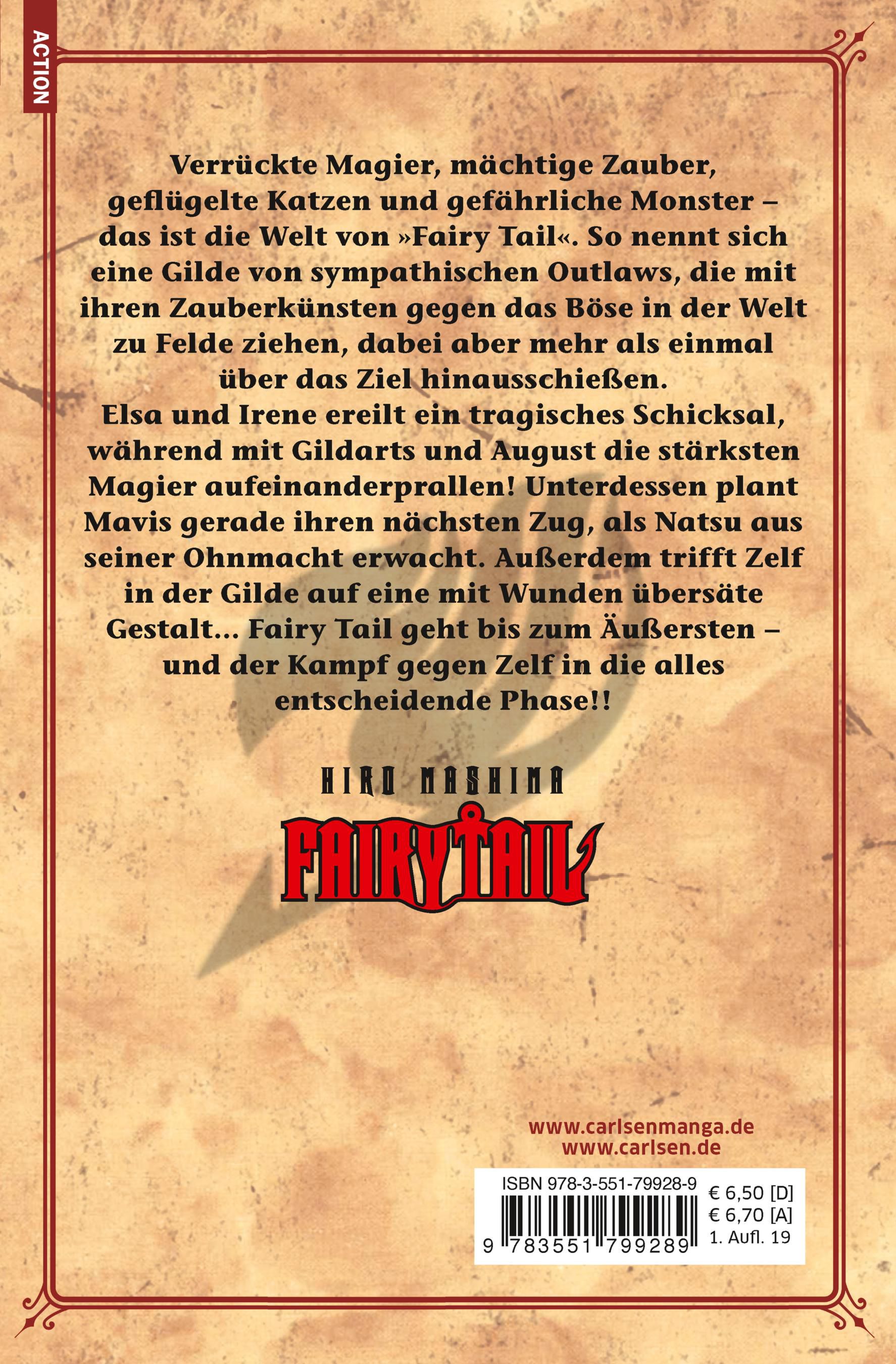 Elsa und Irene ereilt ein tragisches Schicksal, während mit Gildarts und August die stärksten Magier aufeinanderprallen! Unterdessen plant Mavis gerade ihren nächsten Zug, als Natsu aus seiner Ohnmacht erwacht. Außerdem trifft Zelf in der Gilde auf eine mit Wunden übersäte Gestalt... Fairy Tail geht bis zum Äußersten - und der Kampf gegen Zelf in die alles entscheidende Phase!!