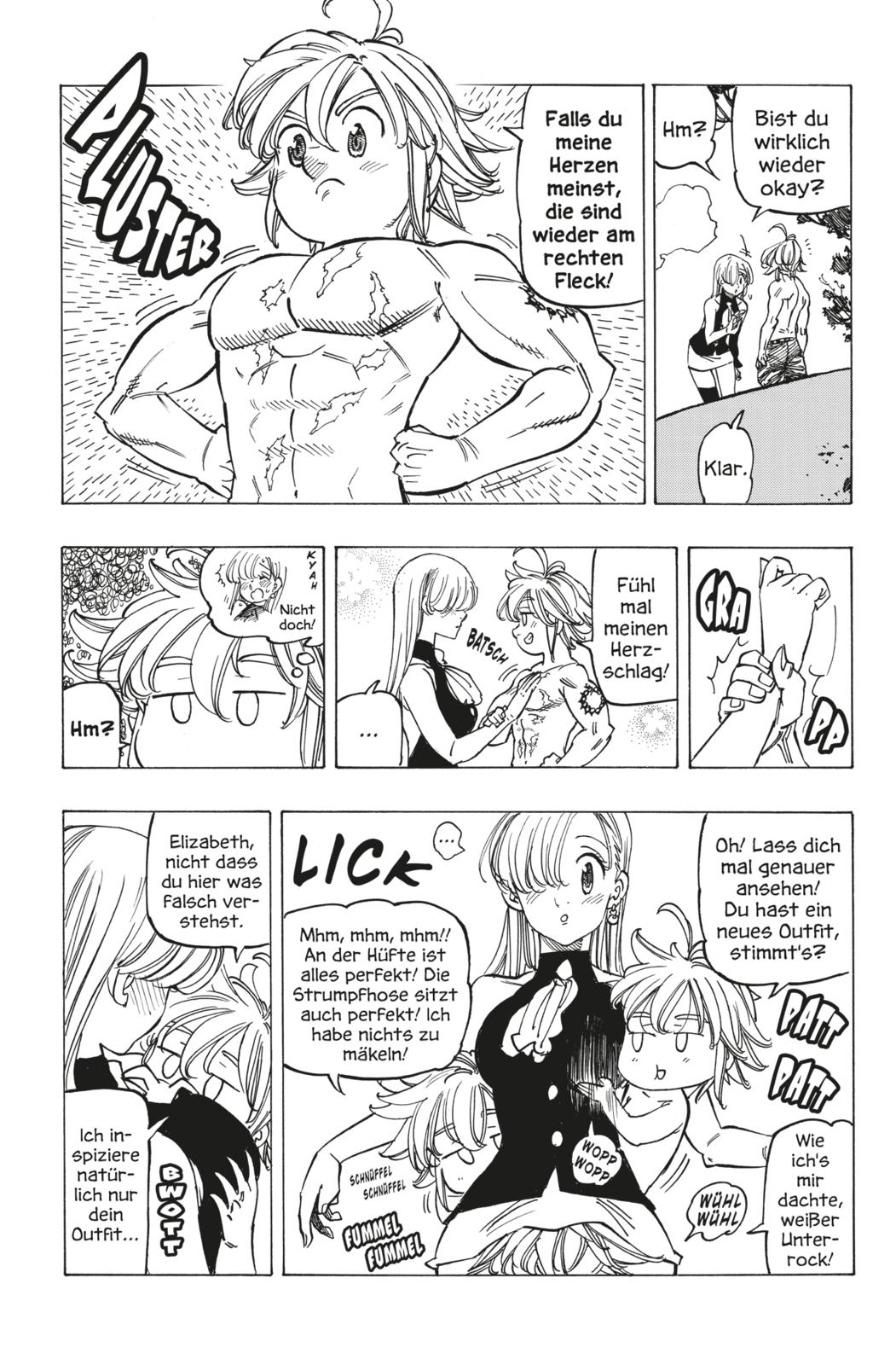 Es steht schlecht um Britannia. Die Heiligen Ritter sind entmachtet, die Bewohner des Schlosses gefangen oder verflucht, und die Zehn Gebote haben Lioness fest im Griff! Doch die Dämonen ahnen nicht, dass Meliodas dem Tod von der Schippe gesprungen ist und sich auf den Weg in die Hauptstadt gemacht hat. Und auch Merlin hat noch einige magische Überraschungen in petto, mit denen sie das Blatt langsam aber sicher wendet...